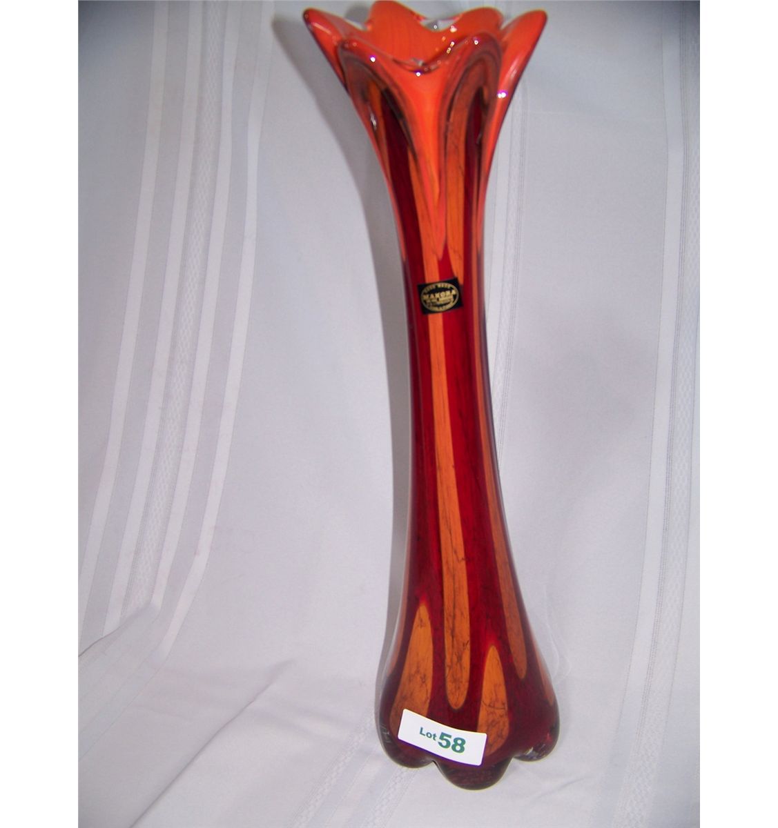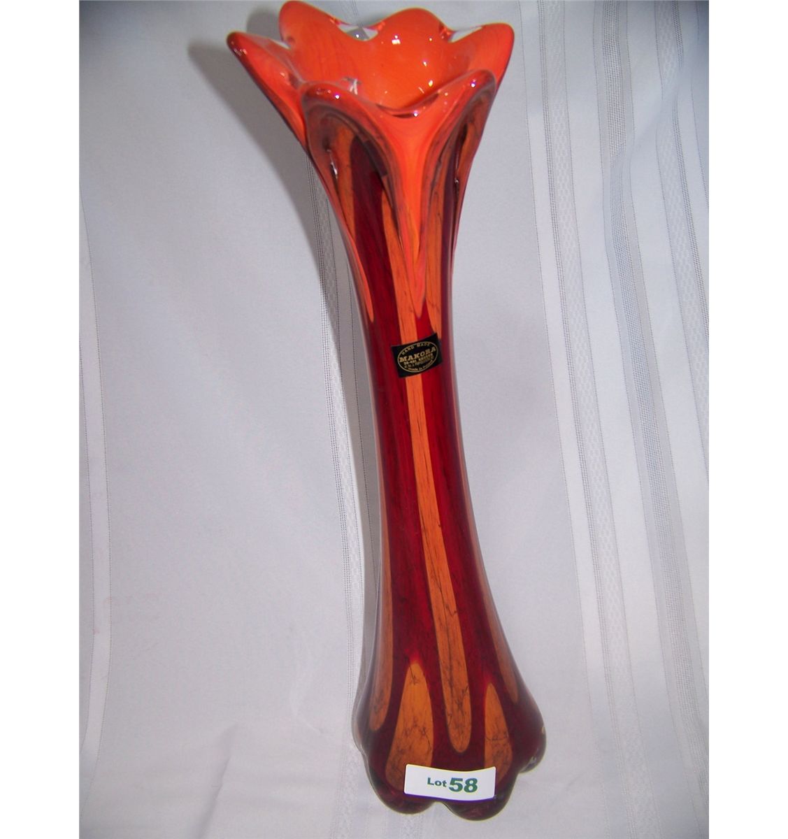 MAKORA  SIGNED, HAND BLOWN MODERN ART GLASS VASE. IN UNIQUE RED & ORANGE COLORS