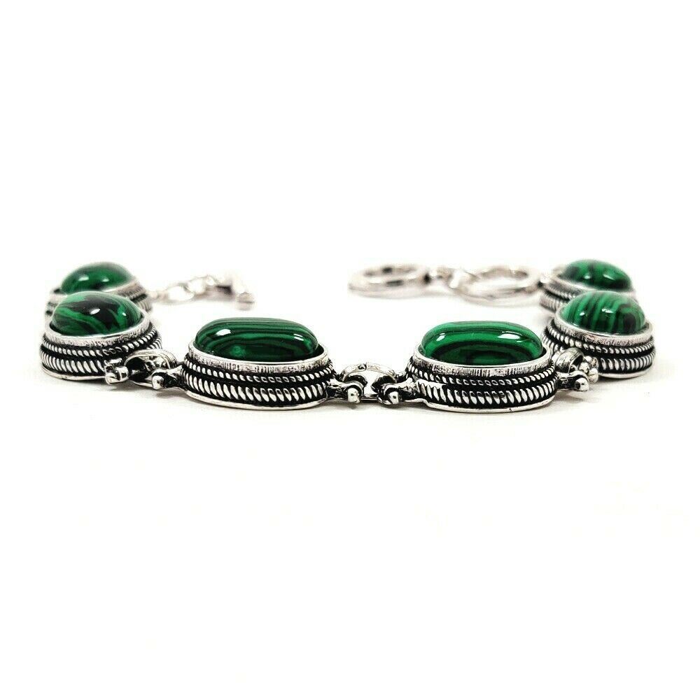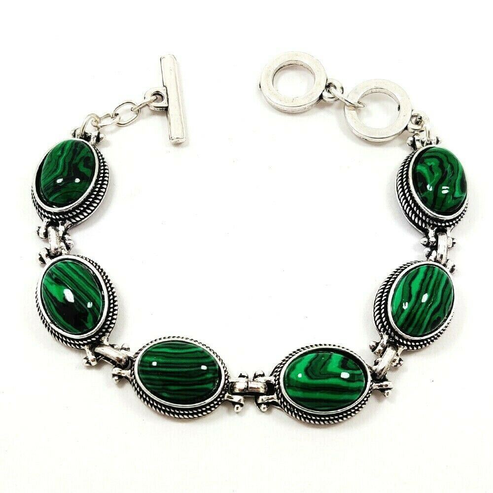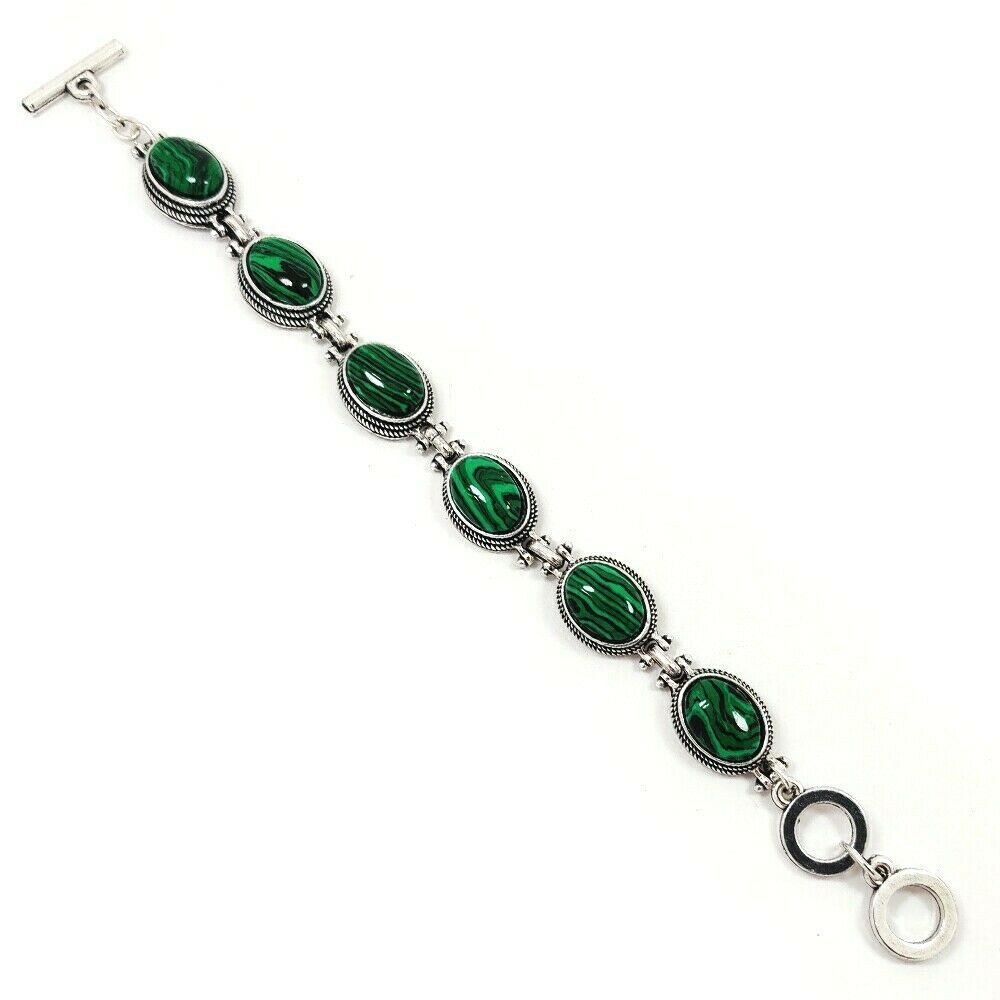 MALACHITE GEMSTONE SILVER PLATED BRACELET JEWELRY , Gemstone : Malachite , Gemstone Size : 10x14mm , Gemstone Shape : Oval , Gemstone color : Green , Base Metal : White Brass , Metal Purity : Silver Plated , Bracelet Size : 8 Inches (With Adjustable Links) , Bracelet Weight Weight : 21.500 Gram , Product Code : SGJBRA1008.
