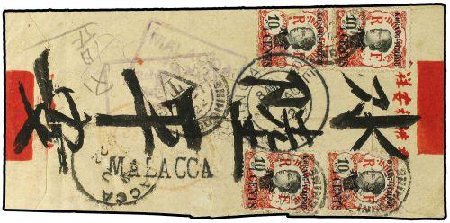1922 Incoming mail from KOUANG-TCHEOU. Chinese red band envelope bearing Kouang-Tcheou Yvert 39, 4 on 10 cent orange (4) tied by INDOCHINA datestamp routed via Singapore, underpaid with various instructionals boxed MALACCA TO PAY 8 CTS and NOT KNOWN/RETOUR in violet with oval DEAD LETTER OFFICE MALACCA in red with manuscript "Refuse". A superb item.
