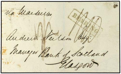 1855 Stampless envelope to SCOTLAND charged "2/6d" in manuscript with boxed BEARING in black sent overland via Marseille with LONDON transit and GLASGOW arrival. Very fine.