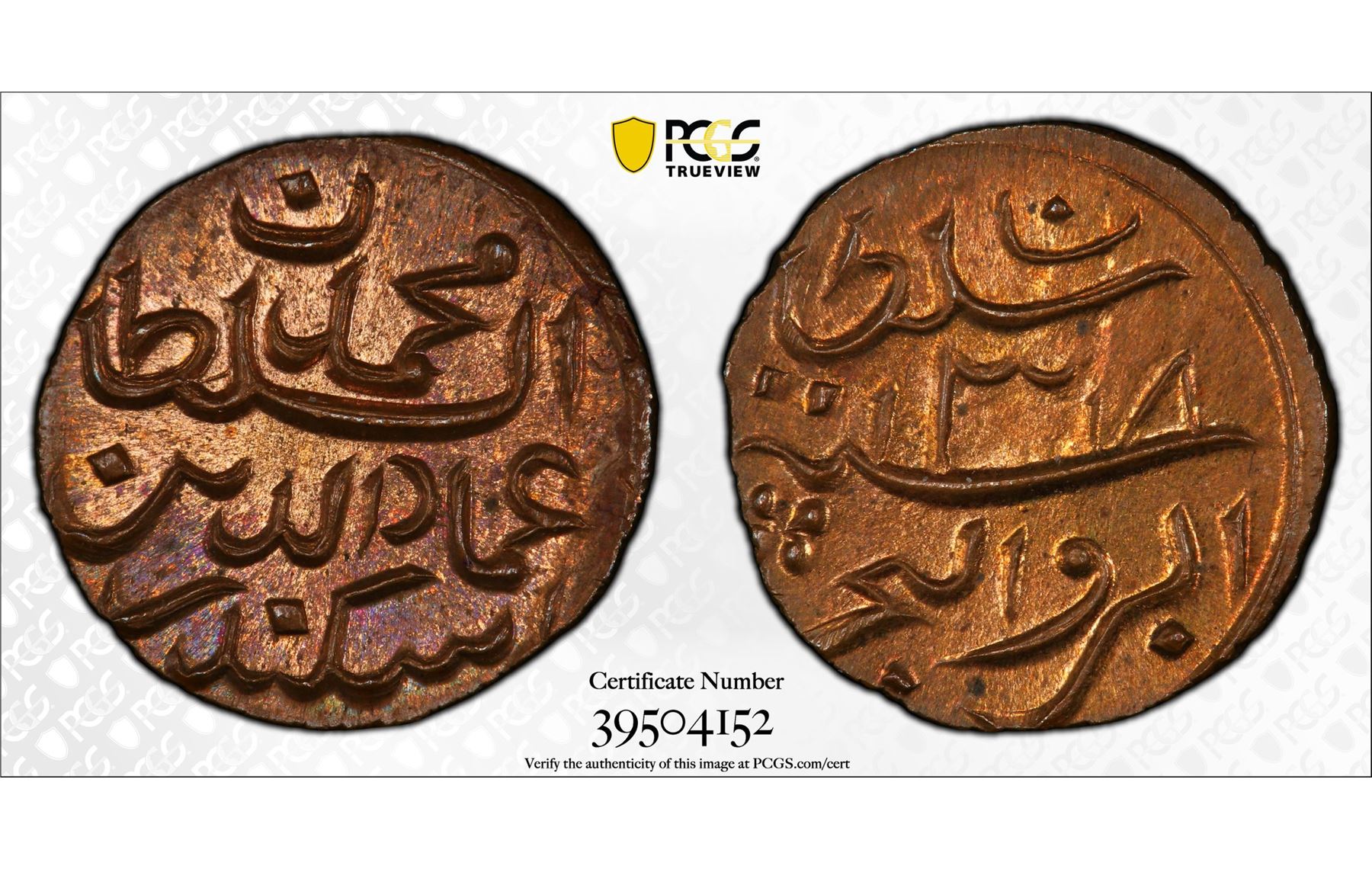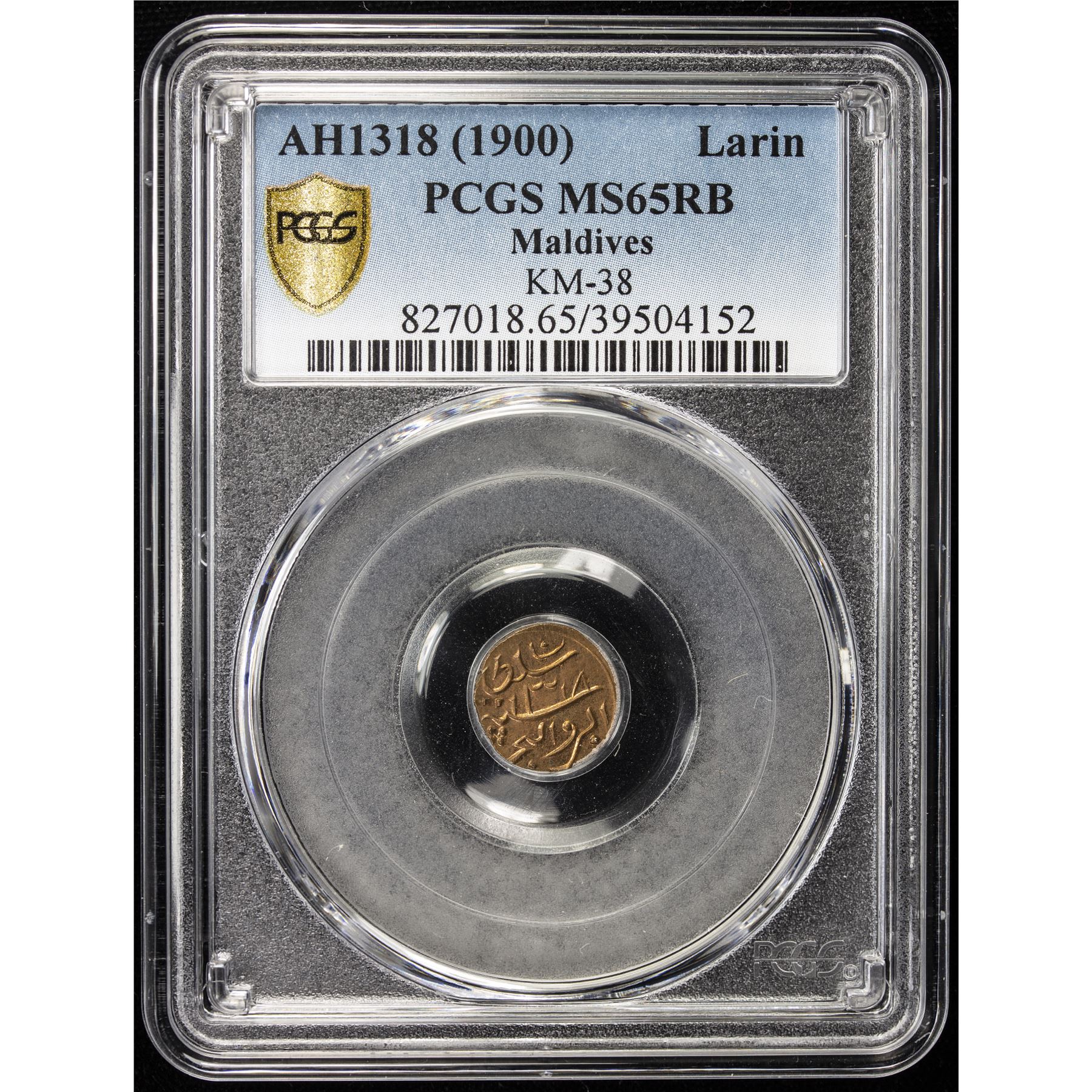 MALDIVE ISLANDS: Muhammad Imaaduddeen VI, 1893-1902, AE larin, Malé, AH1318, KM-38, a lovely example with bright original red mint luster! PCGS graded MS65 RB.
