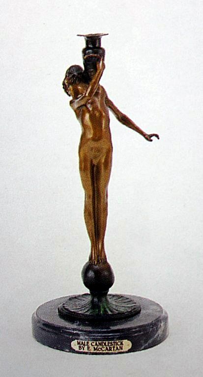 "MALE CANDLESTICK" BRONZE SCULPTURE - AFTER MCCARTAN - BEAUTIFUL COLOR PATINA - MOUNTED ON A FINE ITALIAN MARBLE BASE - BEAUTIFULLY DETAILED - SIGNED - MINT CONDITION - 17"H X 8"W - LOST WAX CAST BRONZE
