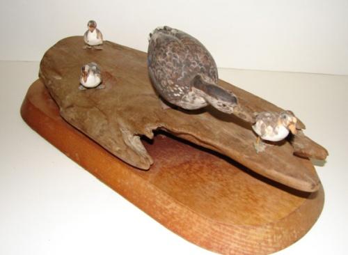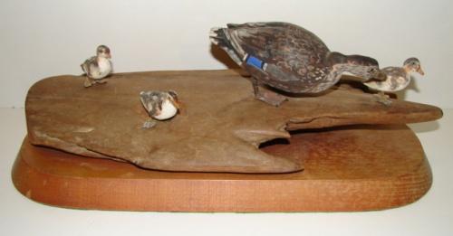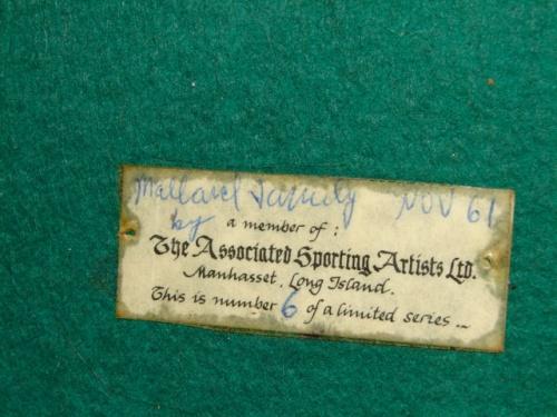 MALLARD DUCK CARVING. Depicts a mallard hen with three ducklings. All are on driftwood base attached to wooden base. Marked with label on bottom that reads “Mallard Family by a member of The Associated Sporting Artists Ltd./Manhasset, Long Island/This is a number 6 of a limited series/Nov. ‘61”. 5” H, 15” L