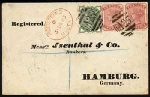 1883 Printed registered env to Hamburg bearing GB 1880 ½d green (SG 164) and pair 1880 2d rose (SG 168) tied to cover by two strikes 'A25' with oval reg ds in red alongside for DE.31.1883, backstamped at Napoli for JA.4.1884 and Hamburg for JA.7.1884, fin