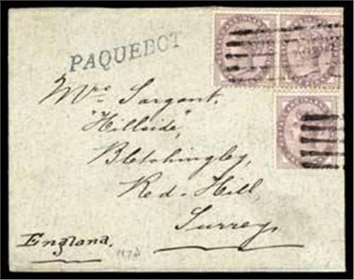1899 env to England unusually franked by three GB 1881 1d lilacs (SG 172) cancelled by 'MALTA' in bars and showing a superb 'PAQUEBOT' h/s in blue, backstamped by 'MALTA' cds for MR.7.1899 and by 'REDHILL/STATION OFFICE' cds for MR.11.1899, clear and attr