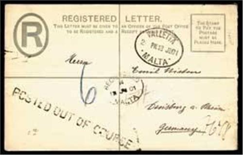 1901 2d reg P/S env to Germany without adhesive to pay the postage, rated '6' in m/s and showing very fine strike of POSTED OUT OF COUSE in black also 'VALETTA/MALTA' ds for JU.13.1901 and 'REGISTERED/MALTA' ds for JU.13.1901, backstamped with 'DUISBERG'