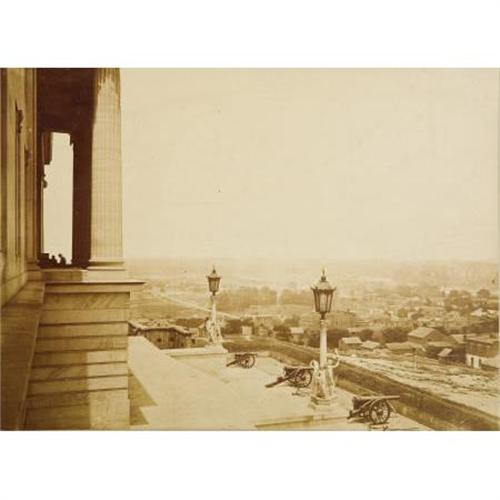 <B>MAMMOTH PLATE “VIEW IN NASHVILLE, TENNESSEE” BY GEORGE BARNARD, 1864.</B></I> George N. Barnard<I> </B></I>(1819-1902) started his career as a daguerreotypest in New York state and worked for Mathew Brady early in the Civil War. He became an official photographer of the Military Division of the Mississippi in time to record the march of Sherman's Army from Tennessee through Georgia to the sea, and then north through the Carolinas. To the North, it was a brilliant, bold and decisive military campaign--a triumph worthy of the monumental commemorative album Barnard issued after the war. To southerners, Sherman's campaign was vicious, bloody, and destructive. Barnard's photograph, with its row of threatening cannons interspersed by decorative statuary groups, shows the capitol as a great stone sentry looming over the rooftops of the rebel city. The tiny silhouetted figures near the columns enhance the monumentality of this statehouse-turned-fortress. This image is plate no. 3 of <I>Barnard’s Photographic Views of Sherman’s Campaign,</B></I> an album of 61 albumen prints. Albumen print, approximately 14 x 11 inches. <BR><B><BR>Condition:</B></I> Fine, has light scratches. <BR><BR><b>Shipping:</b> Flat Material, Large (<a target="_blank" href="http://www.heritageauctions.com/common/shipping.php">view shipping information</a>)