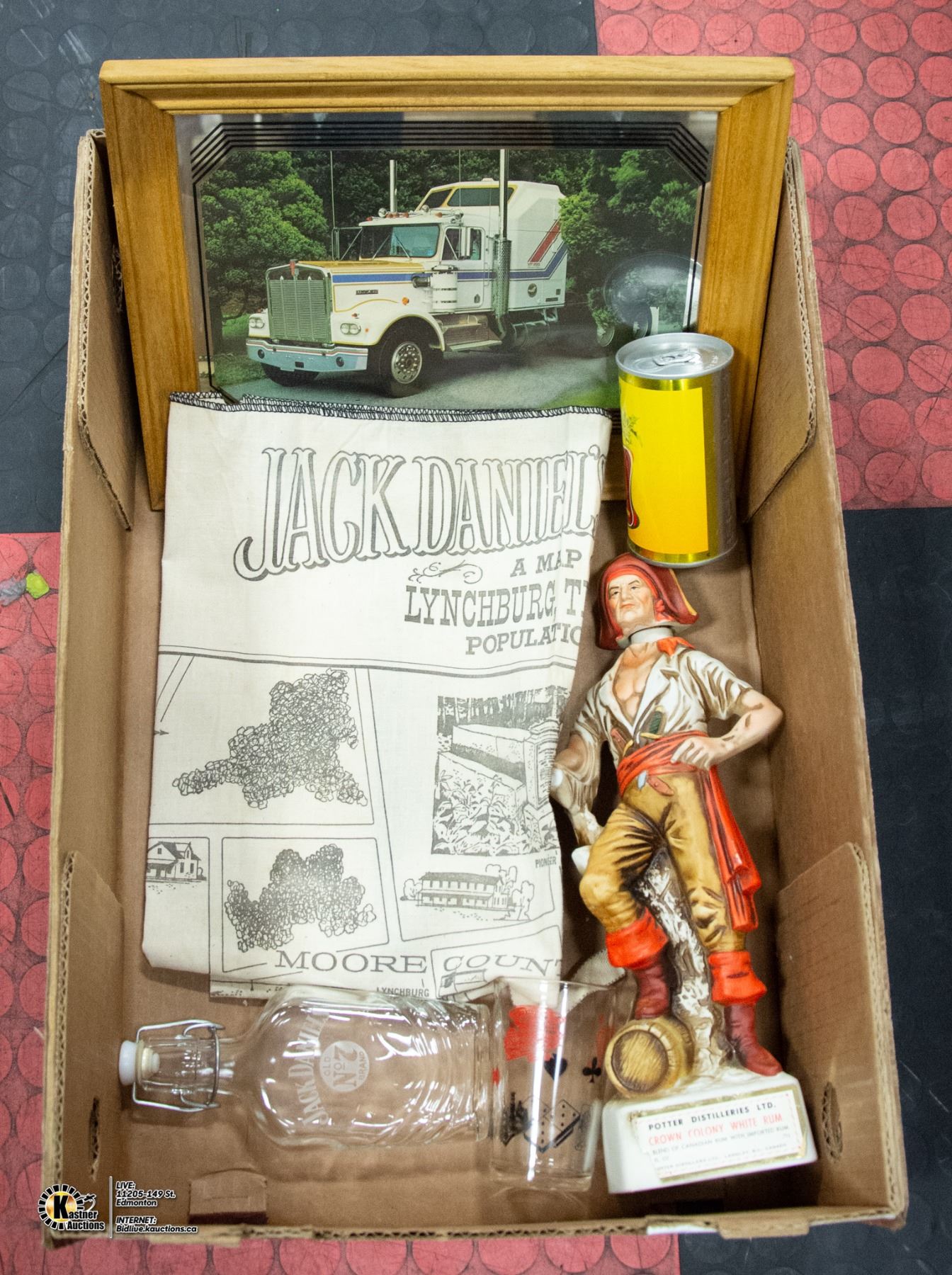 JACK DANIELS BBQ APRON, ETCHED FLASK, OLD PORCELAIN DECANTER & MISC BAR PIECES