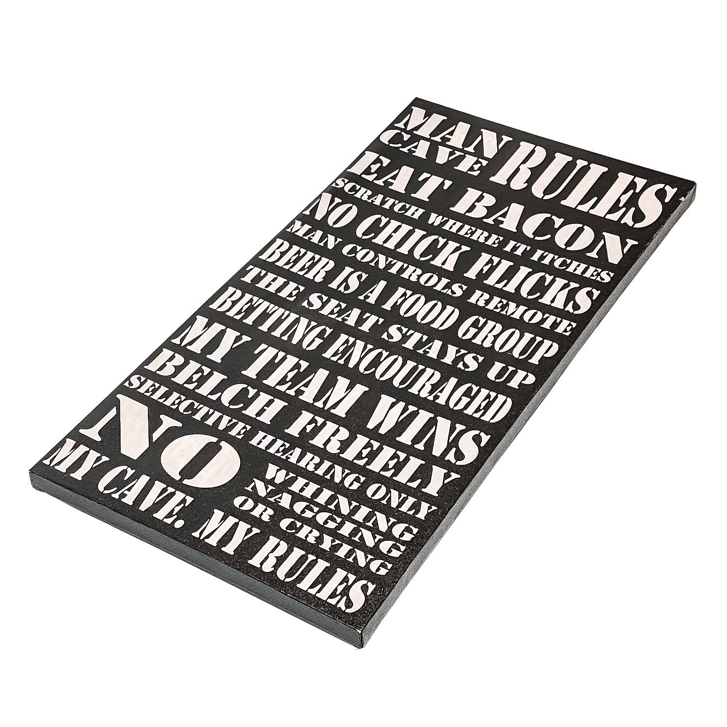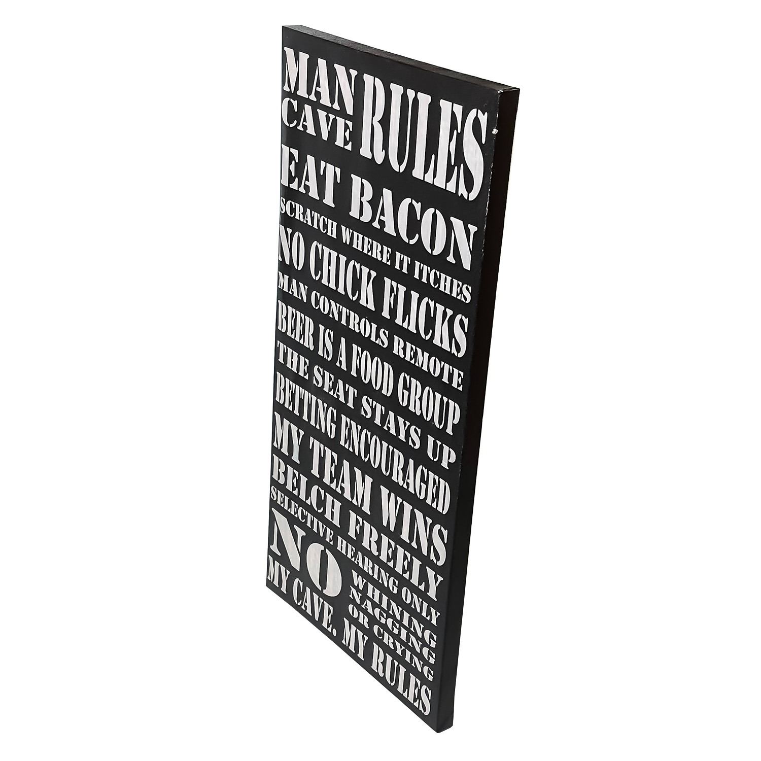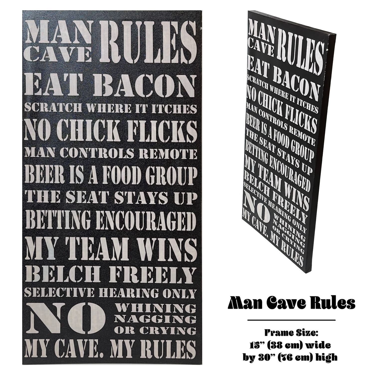 #9044 - WOODEN MAN CAVE RULES SIGN. WOOD SIGN FRAME WITH PRINTED CANVAS RULES. MY CAVE. MY RULES, EAT BACON, BEER IS A FOOD GROUP, NO CHICK FLICKS - YUP… MORE RULES!… LOL. MEASURES 15” (38 CM) WIDE BY 30” (76 CM) HIGH.
