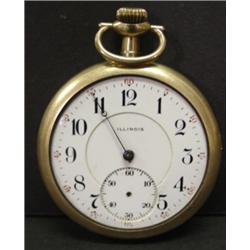 MAN'S ILLINOIS POCKETWATCH. Marked on face "Illinois". Marked on works "Illinois Watch Co.-Springfield-17 Jewels-3007197". Monogrammed on reverse "RHB". Not in working order. Missing face cover and hour hand and second hand.