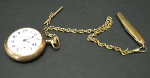 MAN’S POCKET WATCH. Marked on face “Hampden Watch Co.” Chain has knife attachment at end.
