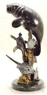 MANANTEE & SEALIFE BRONZE SCULPTURE - 13"H - GREAT ATTENTION TO DETAIL - BEAUTIFUL FINISH - LOST WAX CAST- MOUNTED ON MARBLE BASE