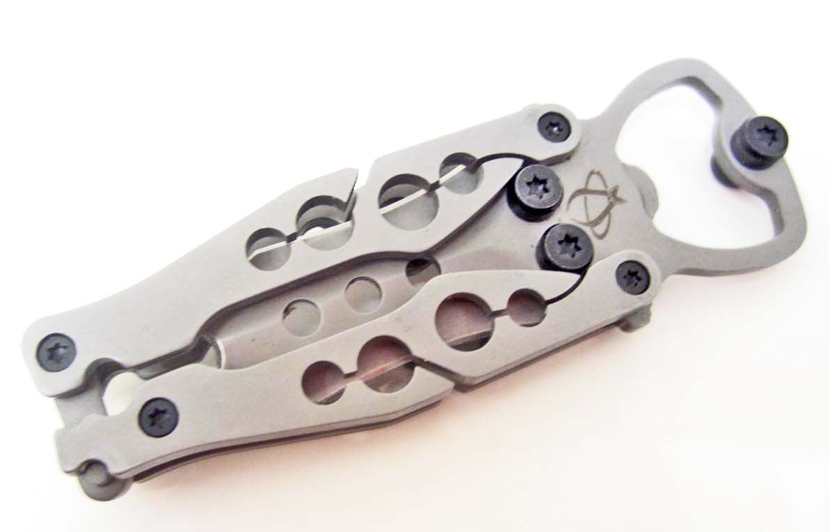 Mantis Bottleneck. Wicked dual tip blade. 3 3/8" closed. 1 1/2" 400 stainless blade with drilled hole design. 400 stainless handles with drilled hole design. Features a patented Latch-Lock with integrated handle springs. Bottle opener. Bead blast finish. Bead blast stainless pocket clip.
