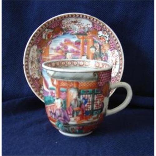 Circa 1775 Chinese Export Porcelain Mandarin Palette Cup and Saucer made for the european, probably french market. The saucer measures 4 7/8" in diameter and is about 1" in depth. The demitasse cup is 2 3/4" in height and the opening is 2 1/2" in diameter Nicely painted mandarin scenes on a veranda showing water and mountains in the background. The cup is in good condition with no chips or hairlines, etc. The saucer has three minor hardly noticeable hairlines around the rim. This wonderful pattern also has a famille rose background on both the cup and saucer. 18TH Century cups and saucer are hard to find especially in this good condition.