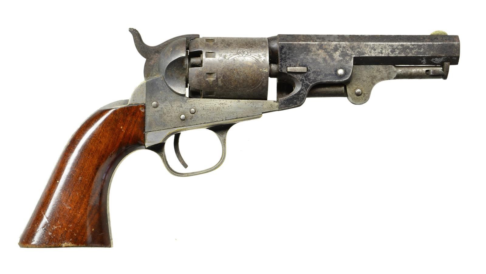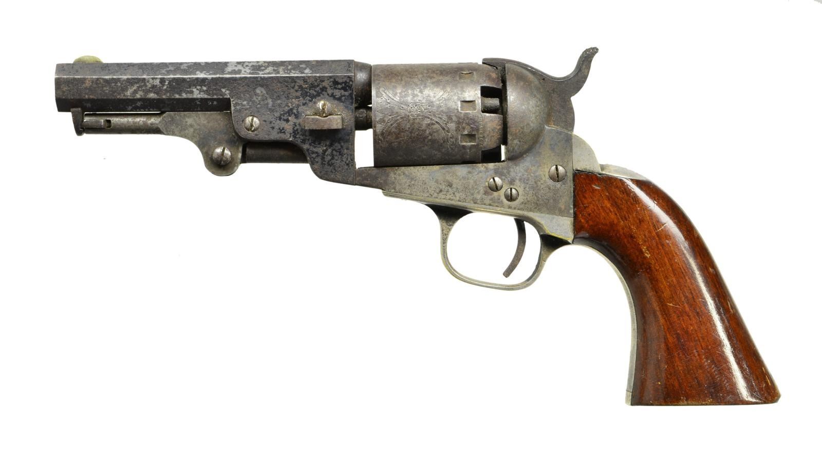 Cal. 36 Percussion. S# 49259. Bbl. 4" AKA "Navy Type" 5 shot cylinder engraved w/ decorative oval panels showing military and naval scenes. Matching S#s throughout including wedge w/ cylinder marked "9259". One piece varnished walnut grips. CONDITION: Metal retains some bright original blue on bottom barrel flat; but balance is a blue/gray patina w/ moderate to heavy spots of rust. Gripstraps are a dull silver plate brass. Grips have an added coat of varnish w/ light scattered dings & scratches. Bore is bright w/ strong rifling but last 1/2" at muzzle moderate to heavy pitting. PROVENANCE STATEMENT: Estate collection of Thomas F. Wolfinger. (01-22192/CW). ANTIQUE. $300-500.