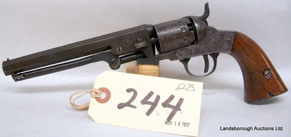 ANTIQUE, REVOLVER, 31 PERCUSSION, 152MM BARREL, SN 321. WOOD GRIPS DENTED AND CHIPPED, BLUING IS BROWN, BORE HAS PITTING, RIFLING PROMINENT. CYLINDER PIN LOOSE, LOADING LEVER IS BENT AND APPEARS A DIFFERENT COLOR IE MAY NOT BE ORIGINAL. STAGE HOLD UP SCENE ON CYLINDER IS EVIDENT.