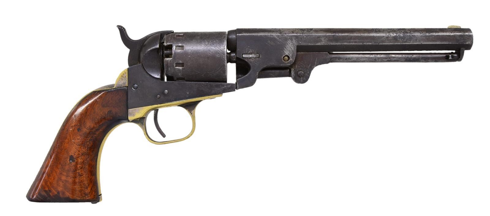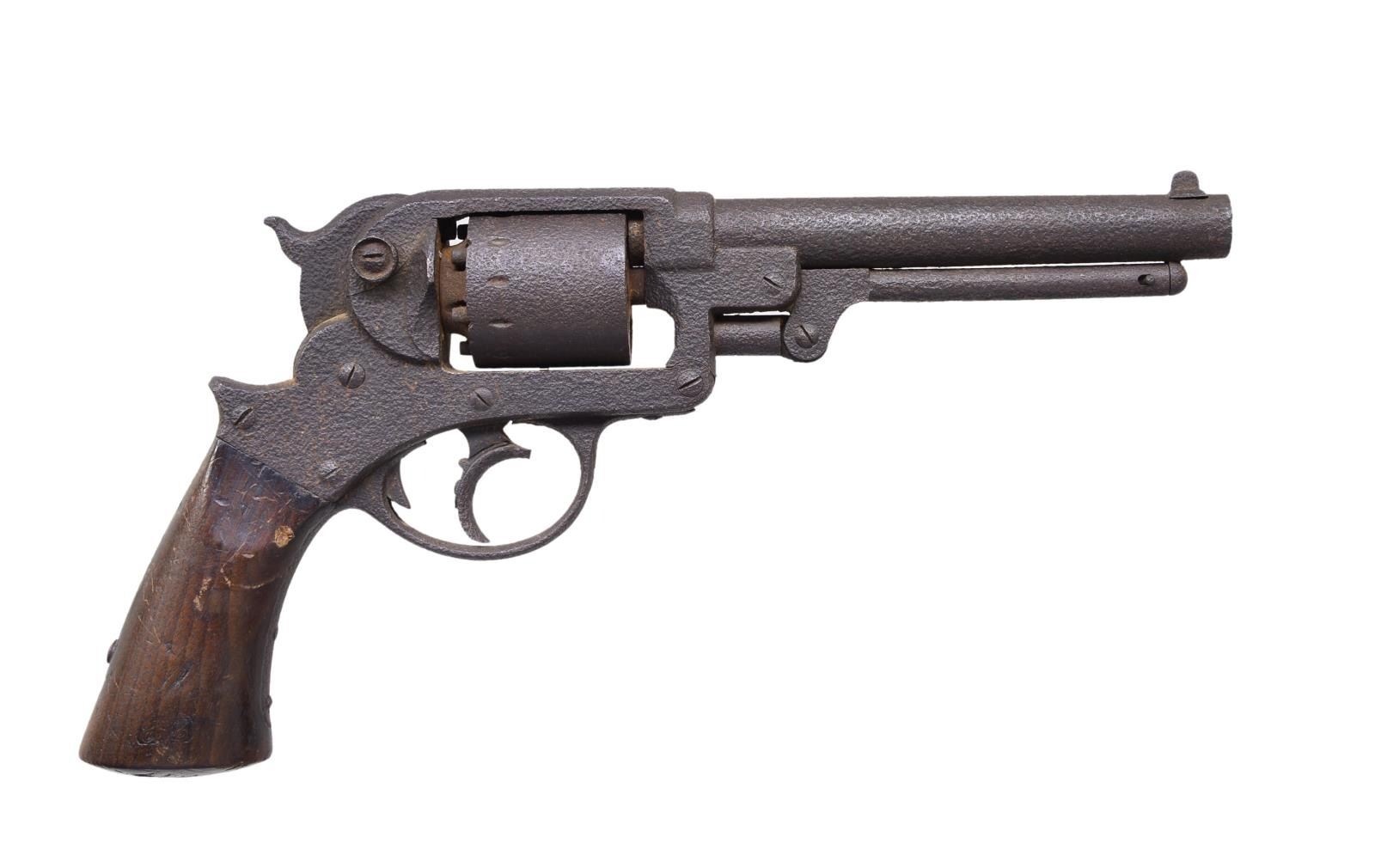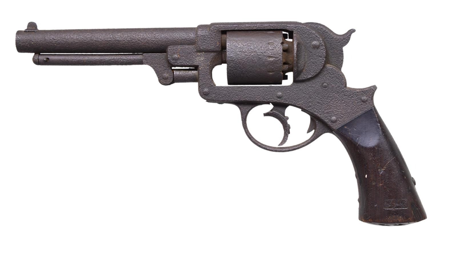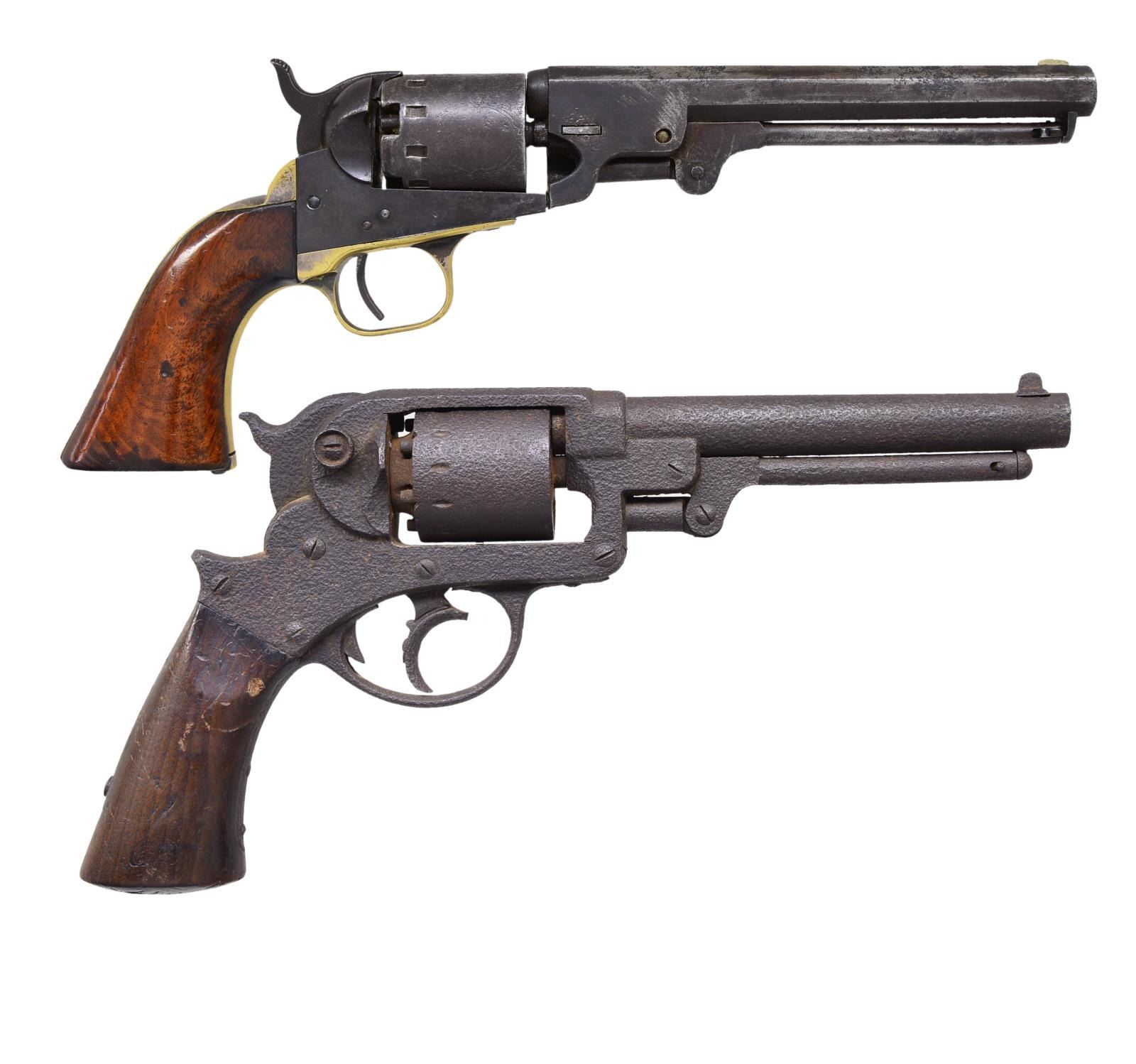 1) MANHATTAN NAVY TYPE. Cal. 36. S# 20279. Bbl. 6 1/2" oct. w/ blade sight. 5 Shot roll engraved cyl. Blue finish w/ silver finished brass trigger guard & back strap. 1 Piece walnut grip. CONDITION: metal has dark mottled patina appearance w /spots of deep pitting. Cyl. retains 40% scene. Grip straps retain 10% silver. Grips show light finish wear w/ numerous dents. Bbl. is extremely loose on action & cyl. does not rotate properly. Dark rusty bore. (01-18308/DS). 2) STARR DA. Cal. 44. NSN. Bbl. 6" rnd. w/ semicircular sight. 6 Shot rnd. cyl. 1 Piece walnut grips w/ clear cartouches. CONDITION: relic condition. Metal has dark rusty appearance w/ general deep pitting. Grips show wear w/ numerous dents & handling marks having lg. chip at butt. Action will not function. Dark rusty bore. (01-18322/DS). BOTH ANTIQUE. $500-900.
