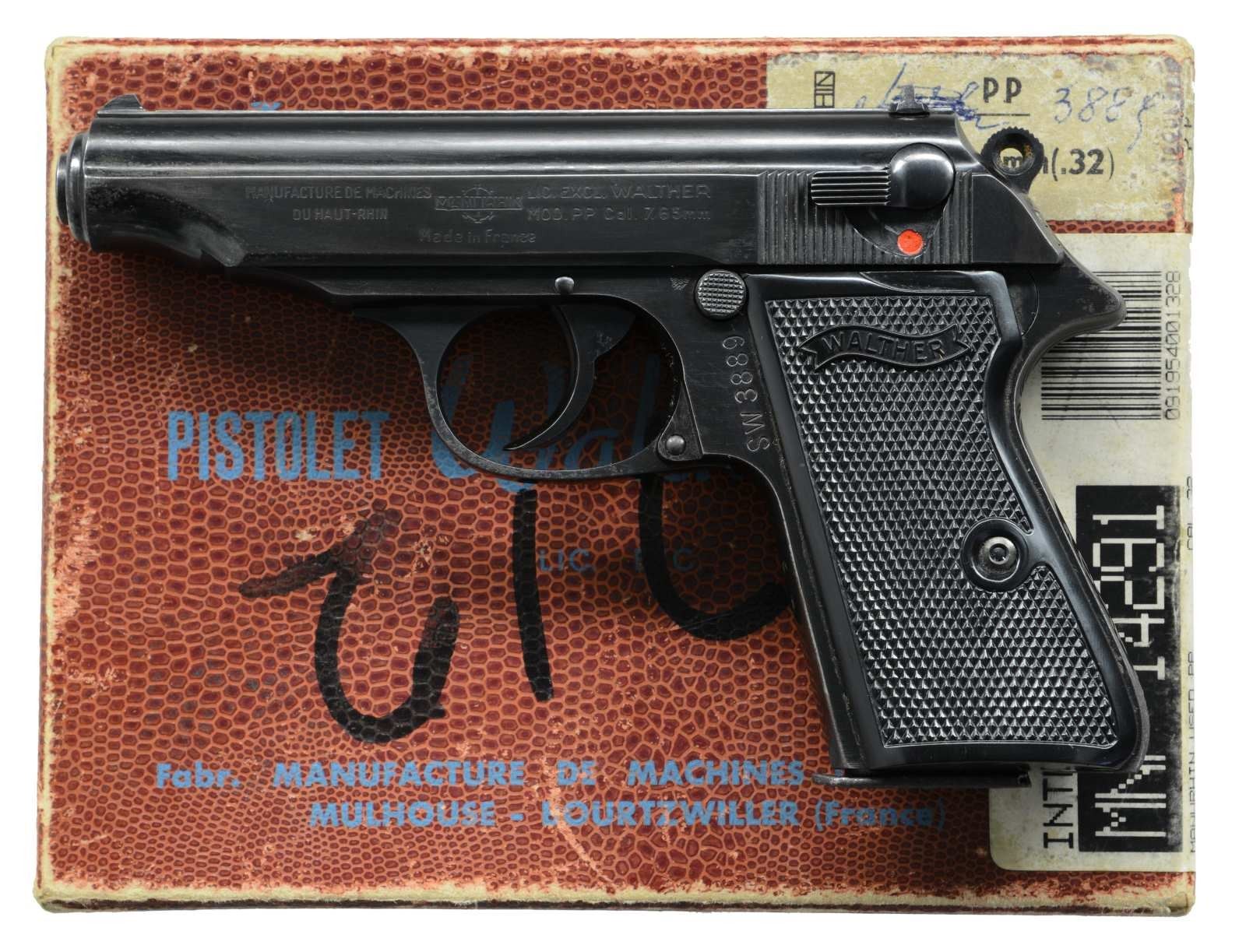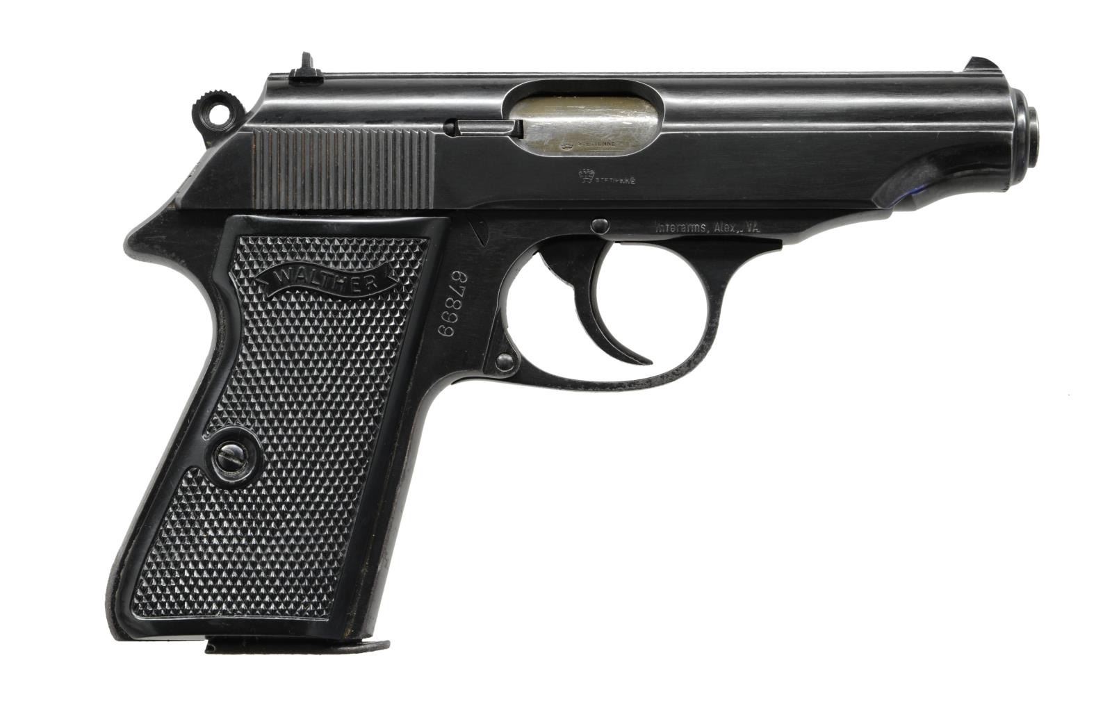 Cal. 7.65mm (32 ACP). S# 67889. Bbl. 3 1/2". Fixed sights. Interarms import marking on frame. Walther Banner grips. MAGS: 1-7 rd. factory that has oxidation on baseplate. UNATTACHED ACCESSORIES: factory boxed matching numbered to gun & brass cleaning rod. CONDITION: grips show light handling wear. Metal retains 80% original blue w/ scattered patches of oxidation most notable on bottom of back strap & top of slide. Very good bright bore. (23-2280/MJC). MODERN. $400-700.