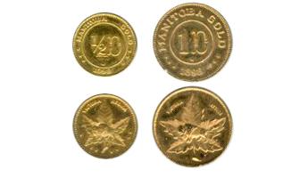 MANITOBA. 1D. & 1/2D. 1898, (Circa 1960). Obv: Buffalo on Maple Leaf. VICTORIA REGINA. S.T.; Rev: MANITOBA GOLD. 1898. .060 ounces. (1.6 grams) and .090 ounces (2.4 grams). Both AU, with reflective fields. Ex. 1990 C.N.A. auction.