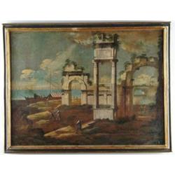 Lot # 82 MANOR OF MICHELE MARIESCHI (Italian, 1696-1743) “A. CAPRICHIO WITH FIGURES BEFORE COASTAL RUINS”. Unsigned, 18th/19th Century. Large oil on canvas scene shows two boats docked next to large classical style building ruins. Several people are on boats and walking around ruins. Housed in a bronzed and ebonized molded wood frame. SIZE: 32-1/4” x 44”. CONDITION: Some inpainting, one small chip to right corner. Otherwise very good. 9-99186 (1,750-2,250)