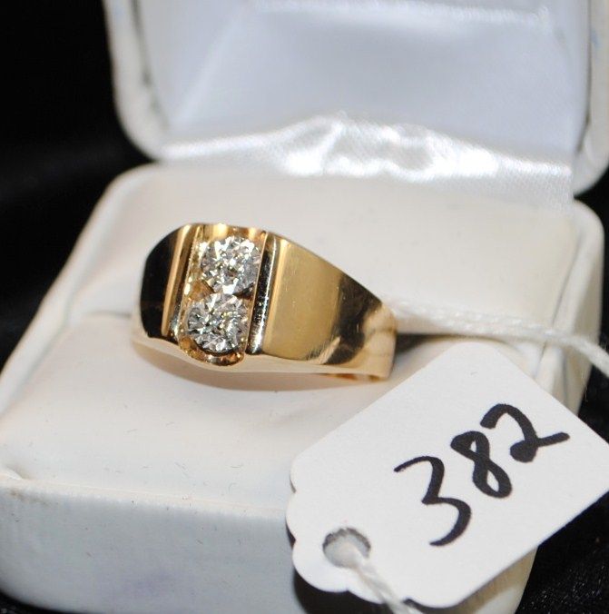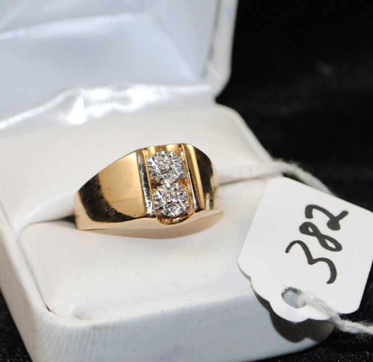 MANS 10K YELLOW GOLD DIAMOND RING WITH TWO DIAMONDS - WEIGHS 5.6 GRAMS - APPRAISED RETAIL REPLACEMENT IS $1,395.00 - COMES WITH JEWELERS APPRAISAL CARD FOR INSURANCE