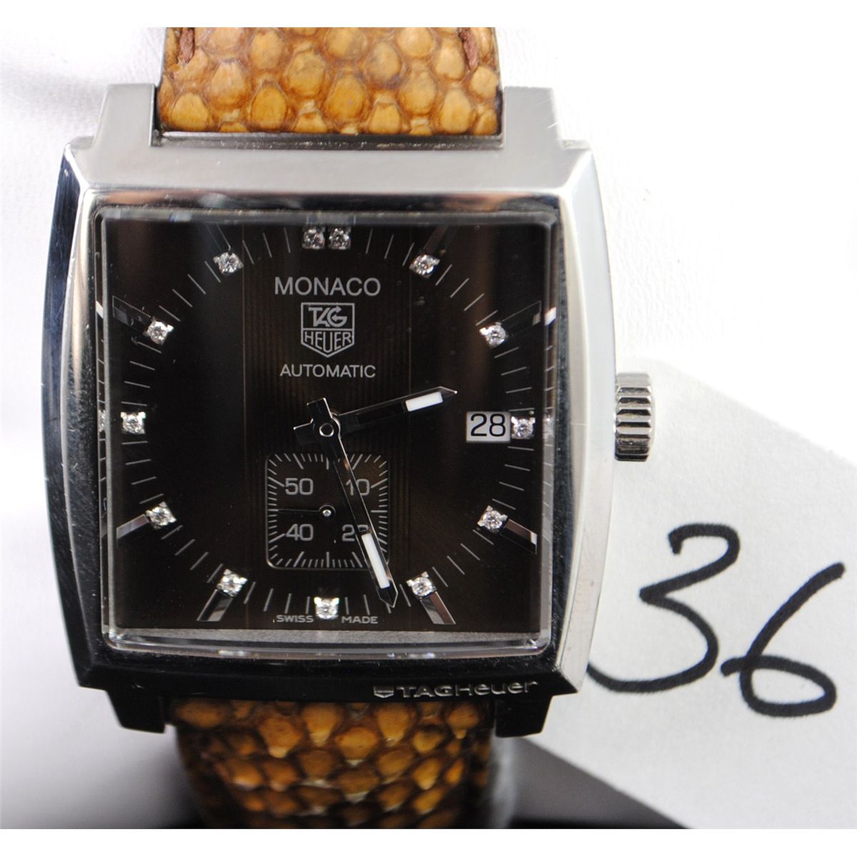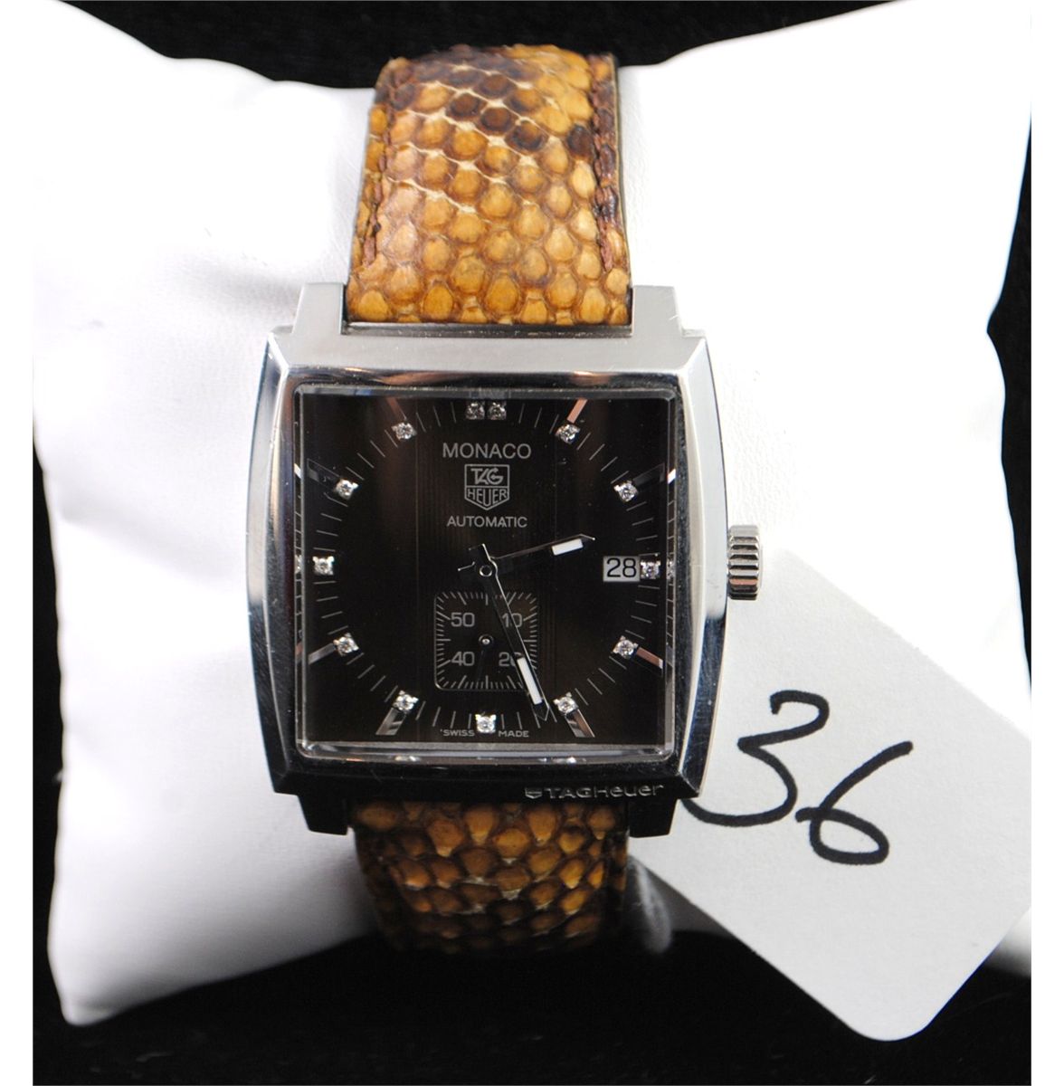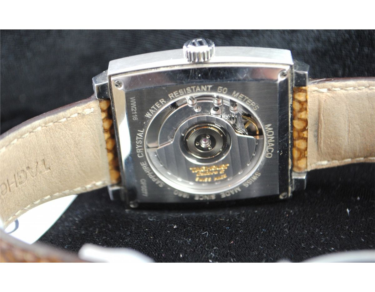MANS "TAG HEUER" WRISTWATCH - MONACO MODEL - DIAMOND DIAL - AUTOMATIC - SAPPHIRE CRYSTAL - ORIGINAL BAND - NEW RETAIL REPLACEMENT $5,000.00