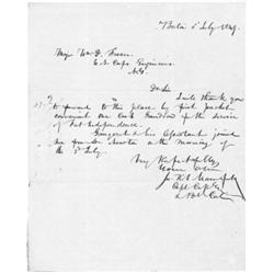 <b>598. JOSEPH K.F. MANSFIELD</b> (1822 - 1862) Union General mortally wounded at Antietam, leading his men in a charge. Early A.L.S. "<i>Jos. K. F. Mansfield</i>" 1p. 4to., Boston, July 5, 1849 to Major William Fraser in New York, in part: <i>"...I will thank you to forward to this place by first packet convenient one cask Gaudron for the service of Fort Independence...</i>". Very good with slight ink bleed through and a small hole, not affecting content.<b>$300-400</b>