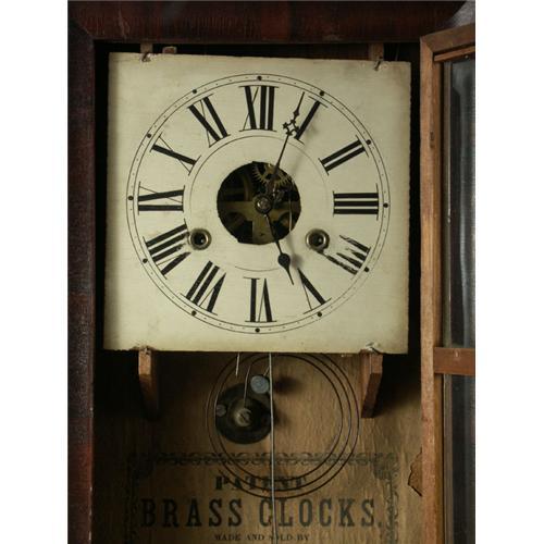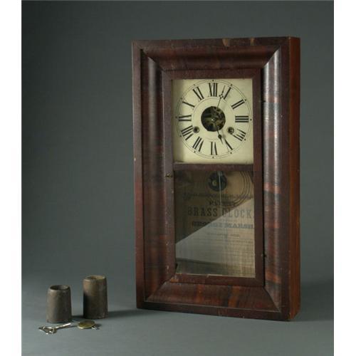 CLOCK, MANTEL STYLE BY GEORGE MARSH: A mantel style Empire style clock manufactured according to the original paper label in the back which states, ''Patent Brass Clock made and Sold by George Marsh, Winchester, Conn''. The clock includes what appear to be the original weights, keys and pendulum, two section door, typical mahogany rolled edge smooth face, 25 ¬'' H X 4 ¬''D X 15'' W, circa 1840 -1860. Note: Multiple missing pieces of veneer, lower section of the door contains clear replacement glass, untested.
