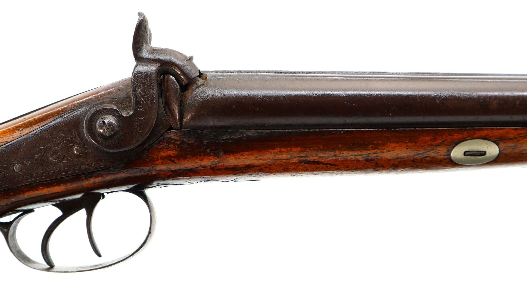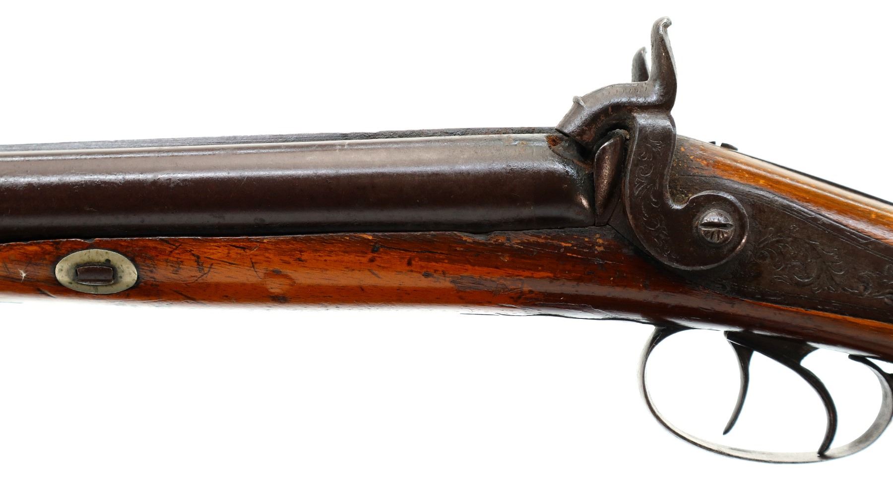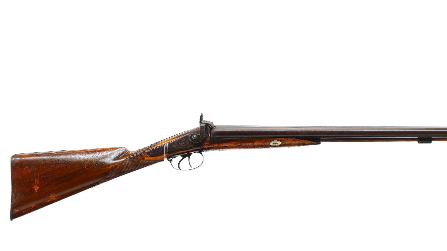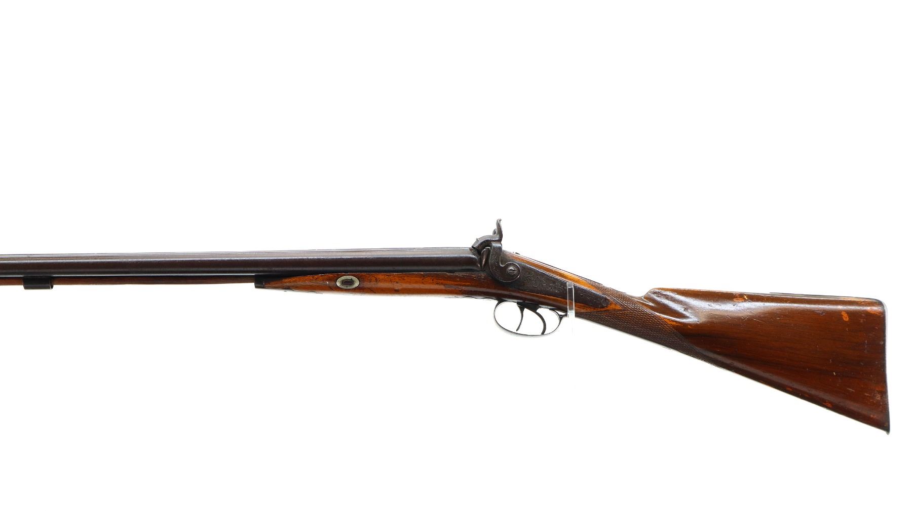Main Description: Brass bead, Damascus barrels with smooth rib, engraved back action locks and checkered spur hammers that function , nipples are damaged, double triggers. One piece half length wood stock, single forearm wedge, checkered straight grip with vanity plate, smooth steel butt plate, wood ramrod with steel tip.