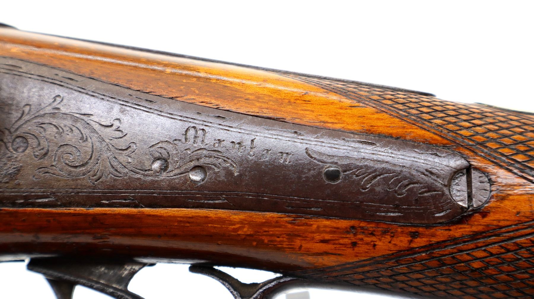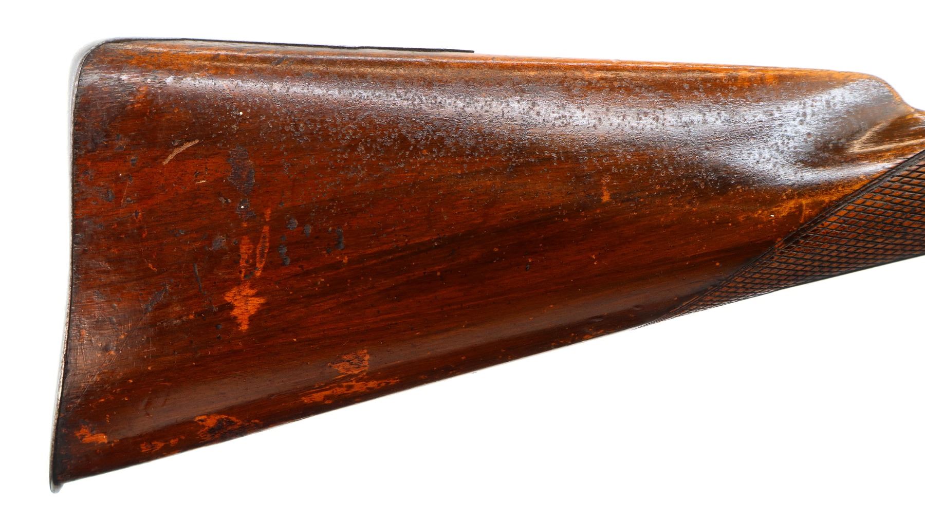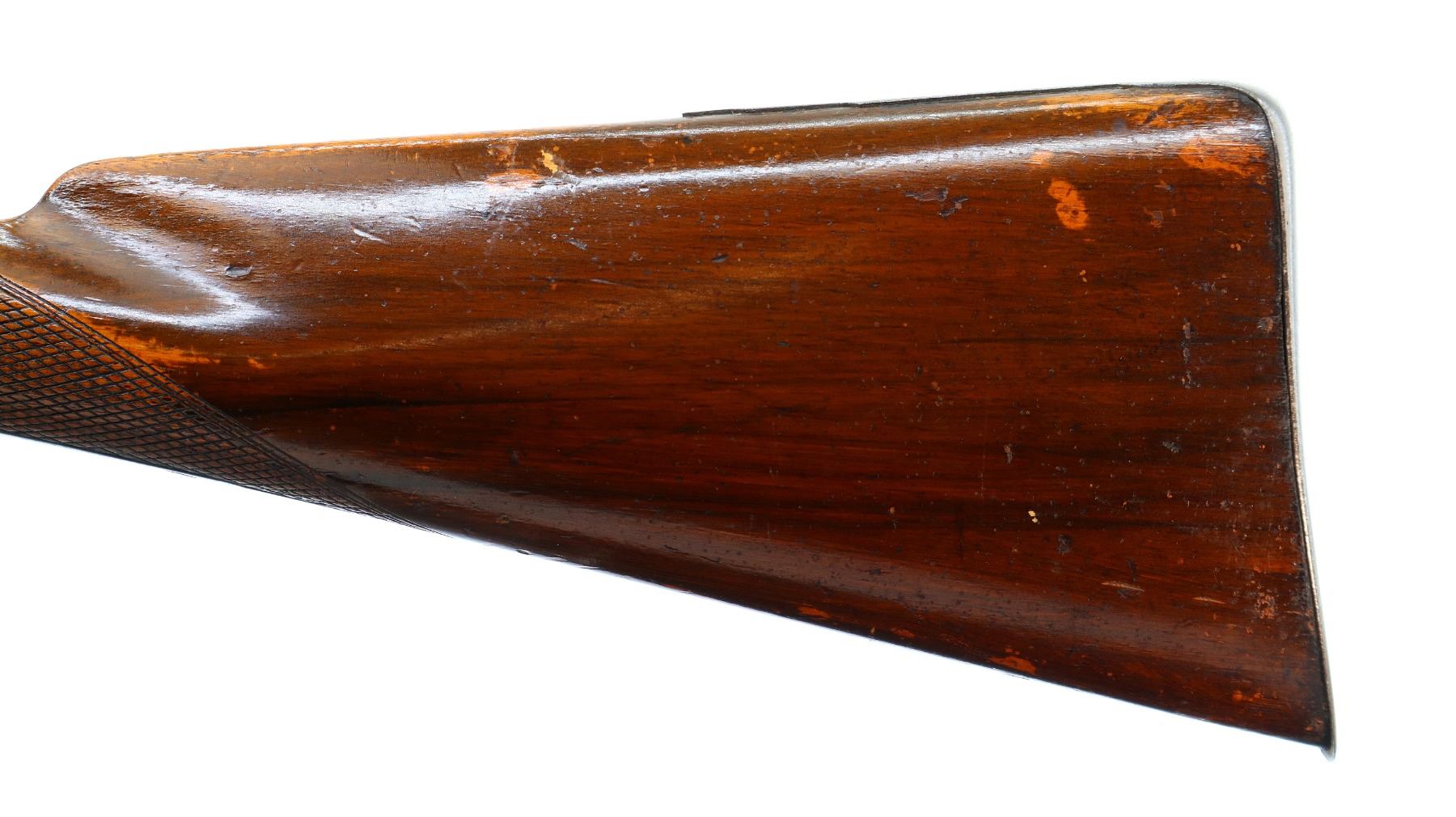 Main Description: Brass bead, Damascus barrels with smooth rib, engraved back action locks and checkered spur hammers that function , nipples are damaged, double triggers. One piece half length wood stock, single forearm wedge, checkered straight grip with vanity plate, smooth steel butt plate, wood ramrod with steel tip.