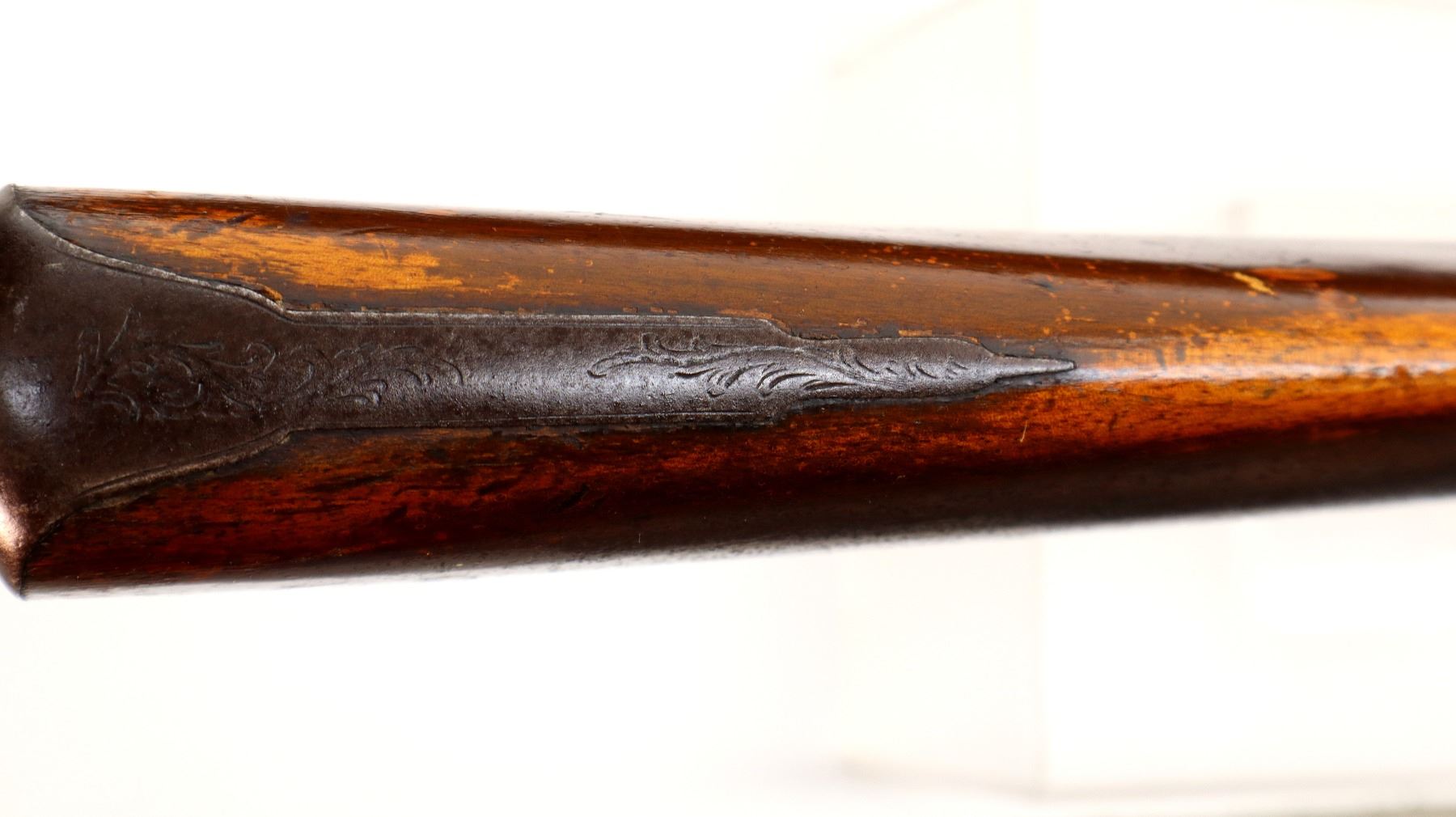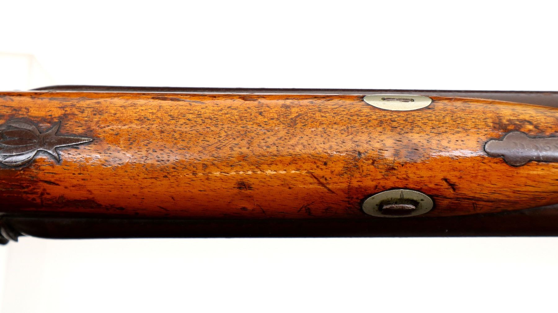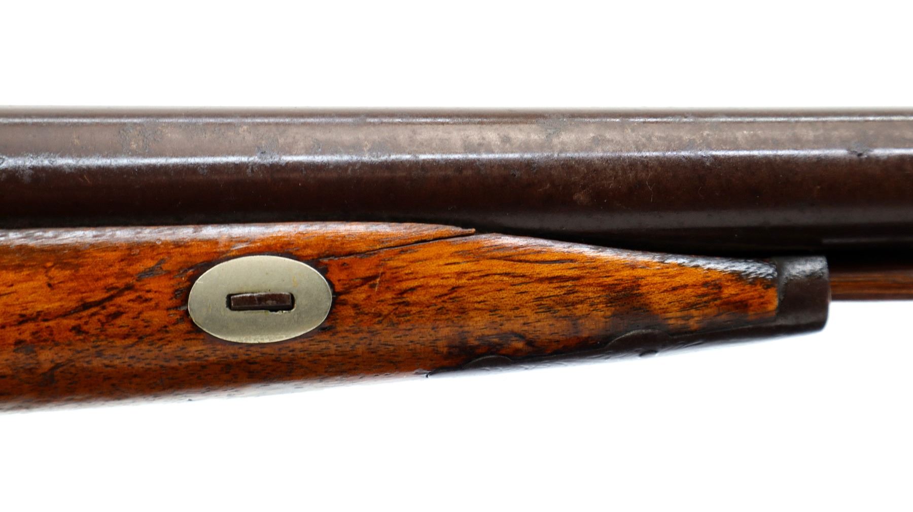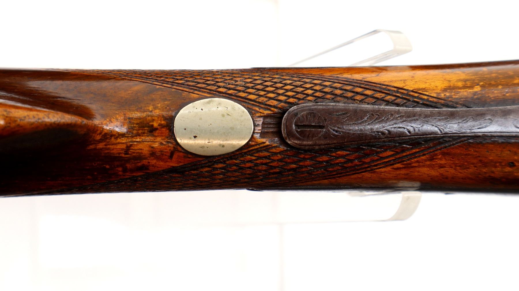 Main Description: Brass bead, Damascus barrels with smooth rib, engraved back action locks and checkered spur hammers that function , nipples are damaged, double triggers. One piece half length wood stock, single forearm wedge, checkered straight grip with vanity plate, smooth steel butt plate, wood ramrod with steel tip.