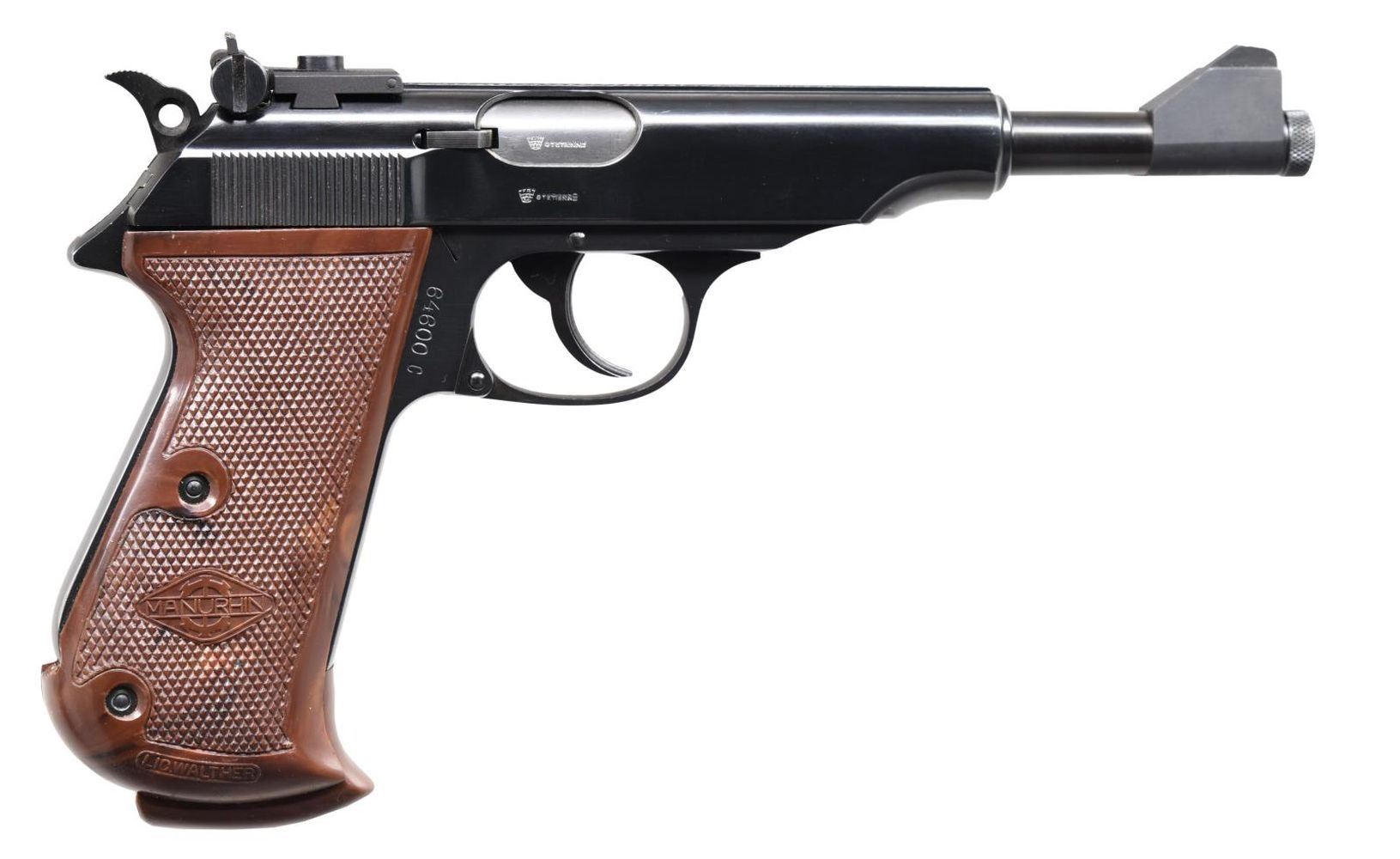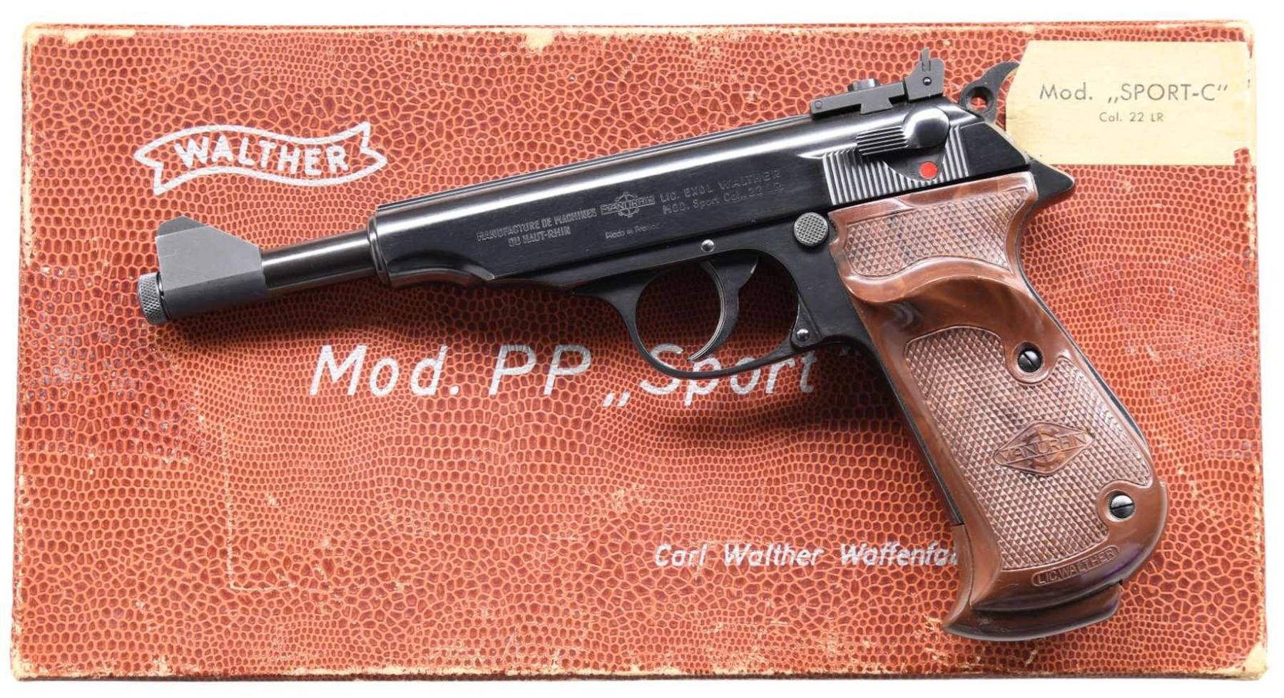 WITH MATCHING FACTORY BOX. Cal. 22 LR. S# 64600 C. Bbl. 6". PP Sport-C semi-automatic pistol mfg. in France by Manurhin under license from Walther. The left side of the slide is marked with Manurhin mfg. information and "LIC. EXCL WALTHER/ MOD. Sport Cal. .22 LR." above "Made in France". Right side of slide and chamber are stamped with a crown followed by "ST ETIENNE". Metal components exhibit a blue finish overall. Frame is mounted with 2-piece Manurhin logo checkered mottled brown thumbrest grips. Mag. is mounted with a matching color grip extension. Threaded bbl. with blade front sight and adj. square notch rear sight. Pistol is single action only. MAGS: 2 10-rd. UUNATTACHED ACCESSORIES: matching Walther factory box containing factory paperwork, a matching Gustav Genschow & Co. retailer tag, a cleaning rod, cleaning brush, as well as 1 spare mag. CONDITION: excellent, with metal components retaining bountiful amounts of their original factory blue finish overall, exhibiting few light superficial marks from handling and storage. Mirror bore, exhibiting well defined rifling throughout. Grips exhibit some light handling marks, with an area of chipping on either grip at the bottom of the rear grip strap. Box exhibits some exterior wear and staining, but otherwise remains sturdy and serviceable. (24-1004/MLW). CURIO. $700-1,000.