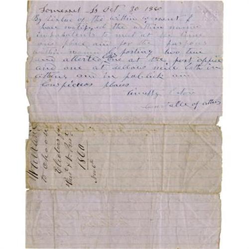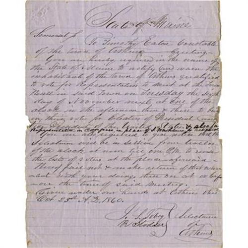 <B>MANUSCRIPT DOCUMENT “LINCOLN’S ELECTION,” STATE OF MAINE, 1860.</B></I> Manuscript Document Signed “A. S. Toby”. One page 7.75” x 10”. "<I>Warrant to choose Electors for Pres & V. Prest. 1860-Nov 6th</B></I>"<I>. </B></I>In part:"<I>To Timothy Eaton Constable of the town of Athens, greeting. You are hereby required in the name of the State of Maine to notify and warn the inhabitants of the town of Athens satisfied to vote for representatives to meet at the Town Hall in said Town on Tuesday the Sixth day of November next at one of the clock in the afternoon then & there to bring in their votes for elections of President and Vice President of The United States</B></I>." A great rare item from the State of Maine.<BR><BR><B>Provenance: </B></I>Al. Emmett Fostell Collection<B> </B></I><BR><BR><B>Condition:</B></I> Very good, minor foxing, small chips.<BR><BR><b>Shipping:</b> Miscellaneous Collectibles, Smal (<a target="_blank" href="http://www.heritageauctions.com/common/shipping.php">view shipping information</a>)