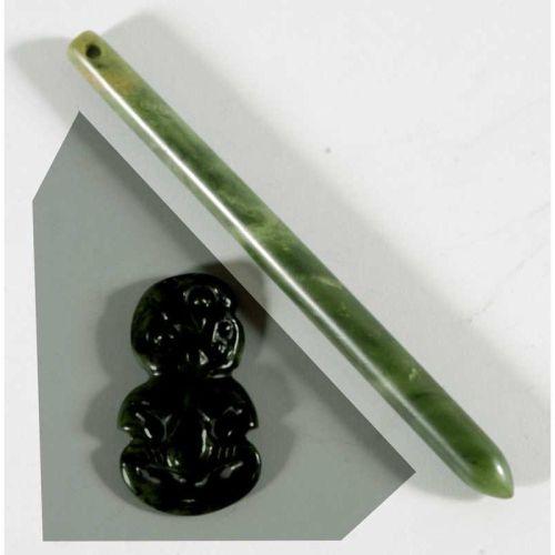 MAORI GREEN STONE TUBULAR PENDANT, 7 3/4" long, CONDITION: excellent, PACKING AND SHIPPING: Fairfield Auction will provide packing and shipping (excluding insurance) within the Continental U.S. for $20. Buyer is welcome to use any other service or pick-up at the gallery.