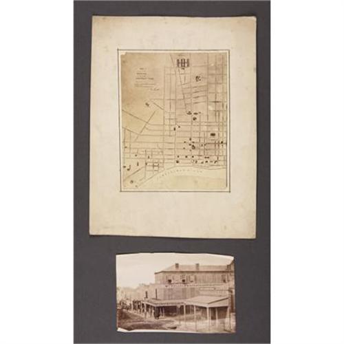<B>MAP OF HOSPITALS OF NASHVILLE, TENNESSEE CA 1860S.</B></I> Abumen print of the military hospitals of the city of Nashville. On card 8.5” x 11.5”. Also, albumen print street scene of Vicksburg, Mississippi. 6” x 4”. <BR><BR><B>Condition:</B></I> Fine, good contrast, print has folds, and tear.<BR><BR><b>Shipping:</b> Flat Material, Small (<a target="_blank" href="http://www.heritageauctions.com/common/shipping.php">view shipping information</a>)