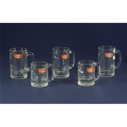 Five vintage A&W root beer glass mugs with the map of the United States logo to include three large 6'' mugs and two smaller 4.5'' mugs.