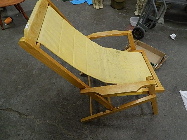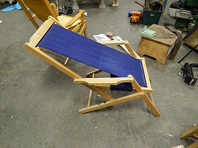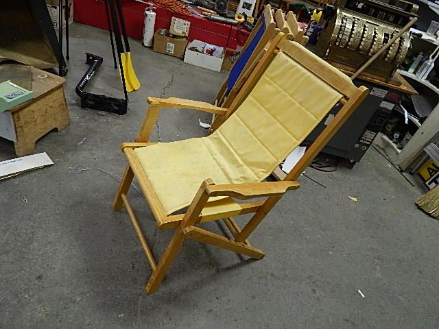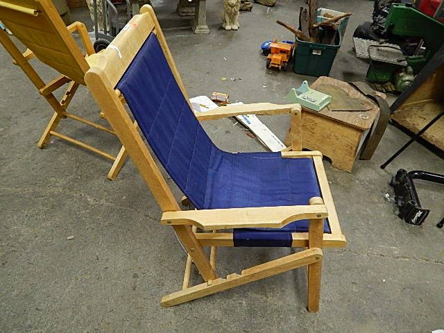 MAPLE & CLOTH SLING CHAIRS - 2 BLUE & 2 YELLOW - RECLINING - BID X 4