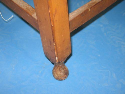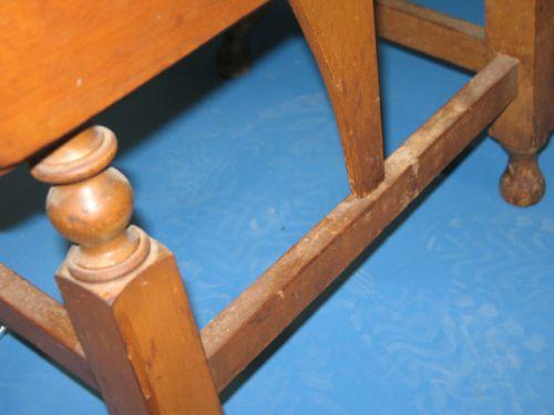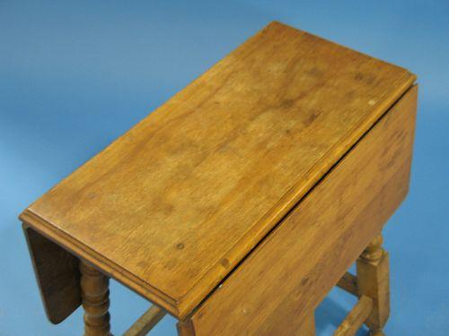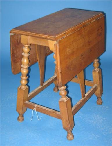 SMALL WILLIAM & MARY STYLE MAPLE GATE LEG DROP-LEAF TABLE. Pegged construction at top. Turned feet. Water damage at top and leaves. 23.25” H, 22” L, 11.25” W. Each leaf: 9.25” W