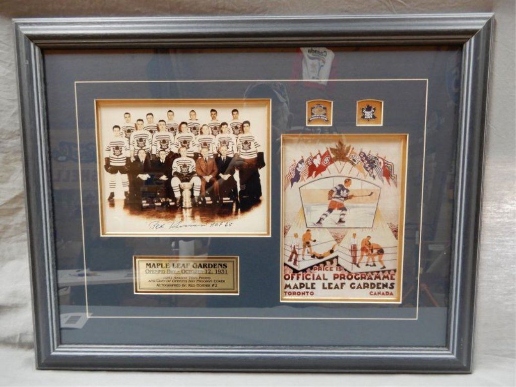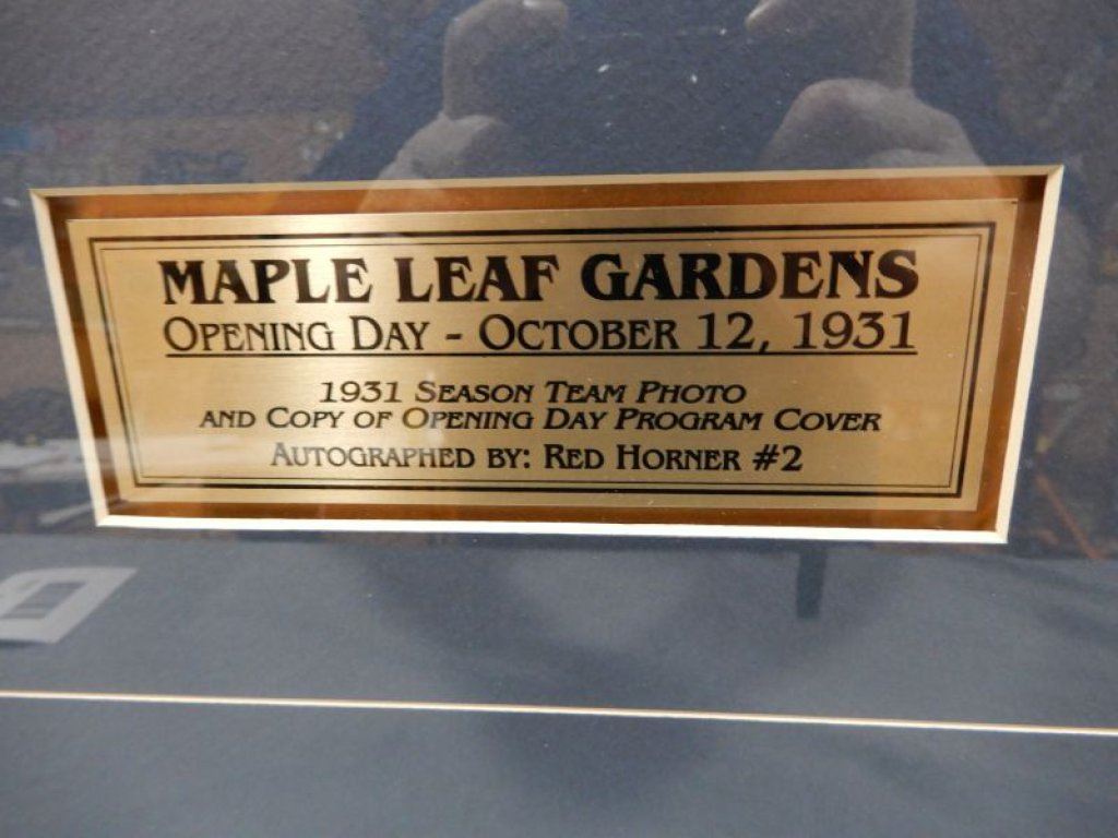 MAPLE LEAF GARDENS OPENING DAY FRAMED PHOTO OCTOBER 12, 1931 - FRAMED 15 CENT OFFICIAL PROGRAM - PHOTO AUTOGRAPHED BY RED HORNER #2 - 27" X 21 1/4" LOCATION: UPPER BACKROOM
