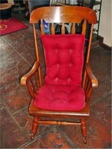 MAPLE ROCKING CHAIR WITH RED UPHOLSTERED SEAT AND BACK CUSHIONS. 41"X23"X29.