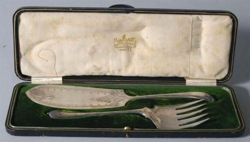 MAPPIN & WEBB SILVERPLATED FISH SET, cased, with 11" server, CONDITION: excellent, no damage or repairs. PACKING AND SHIPPING BY FAIRFIELD AUCTION WITHIN CONTINENTAL USA (excluding insurance) $25,