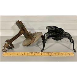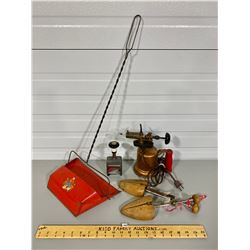 INCLUDES: REPURPOSED BLOW TORCH LAMP. TIN CRUMB COLLECTOR, SHOE LASTS.