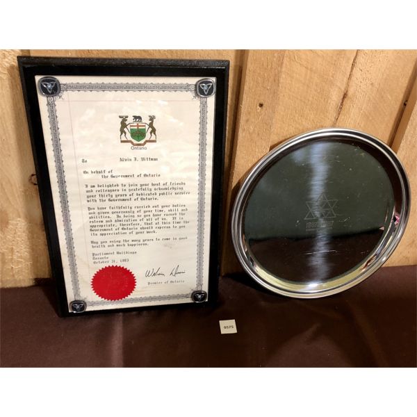 LOT OF 2 - CANADIAN CENTENNIAL TRAY AND 30 YEARS SERVICE CERTIFICATE