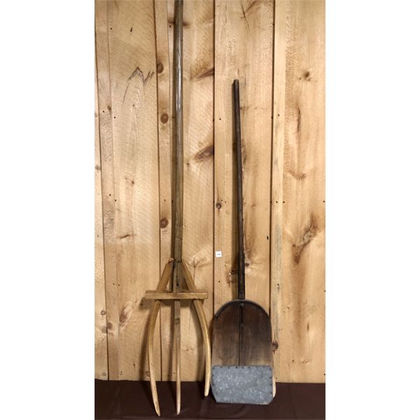 LOT OF 2 - PRIMITIVES - WOODEN PITCH FORK AND SHOVEL