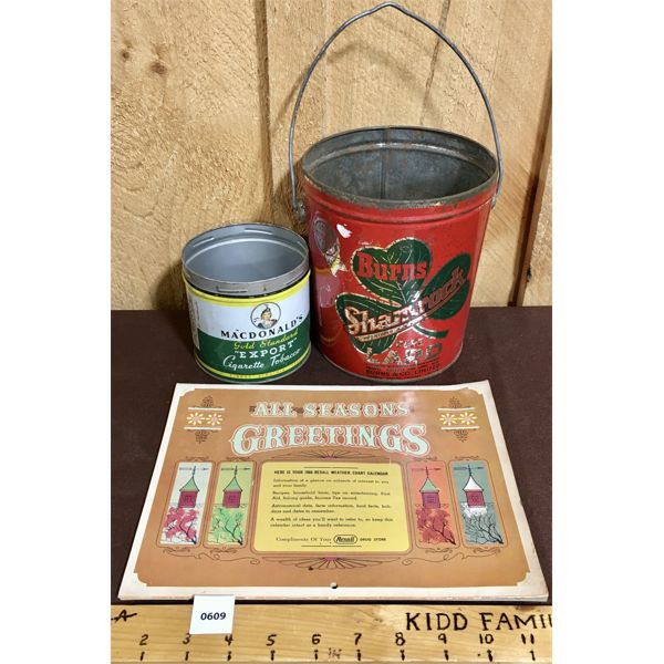 LOT OF 3 - TINS AND 1968 ORILLIA CALENDAR - SHAMROCK LARD, MCDONALDS EXPORT