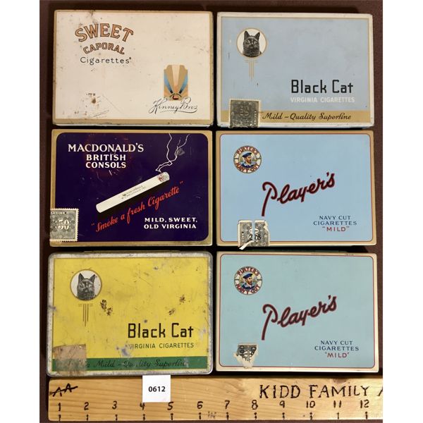 LOT OF 6 - FLAT FIFITIES CIGARETTE TINS - BLACK CAT, PLAYERS, SWEET CAPORAL ECT.
