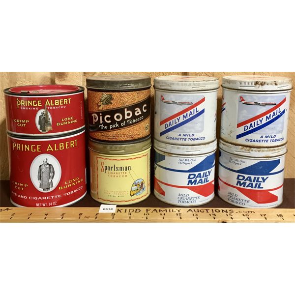 LOT OF 8 - TOBACCO TINS - PRINCE ALBERT, PICOBAC SPORTSMAN, ECT.