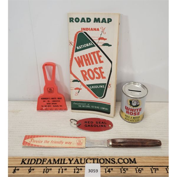 LOT OF 5 - WHITE ROSE 1930'S MAP, COIN BANK & ICE SCRAPER, ETC.