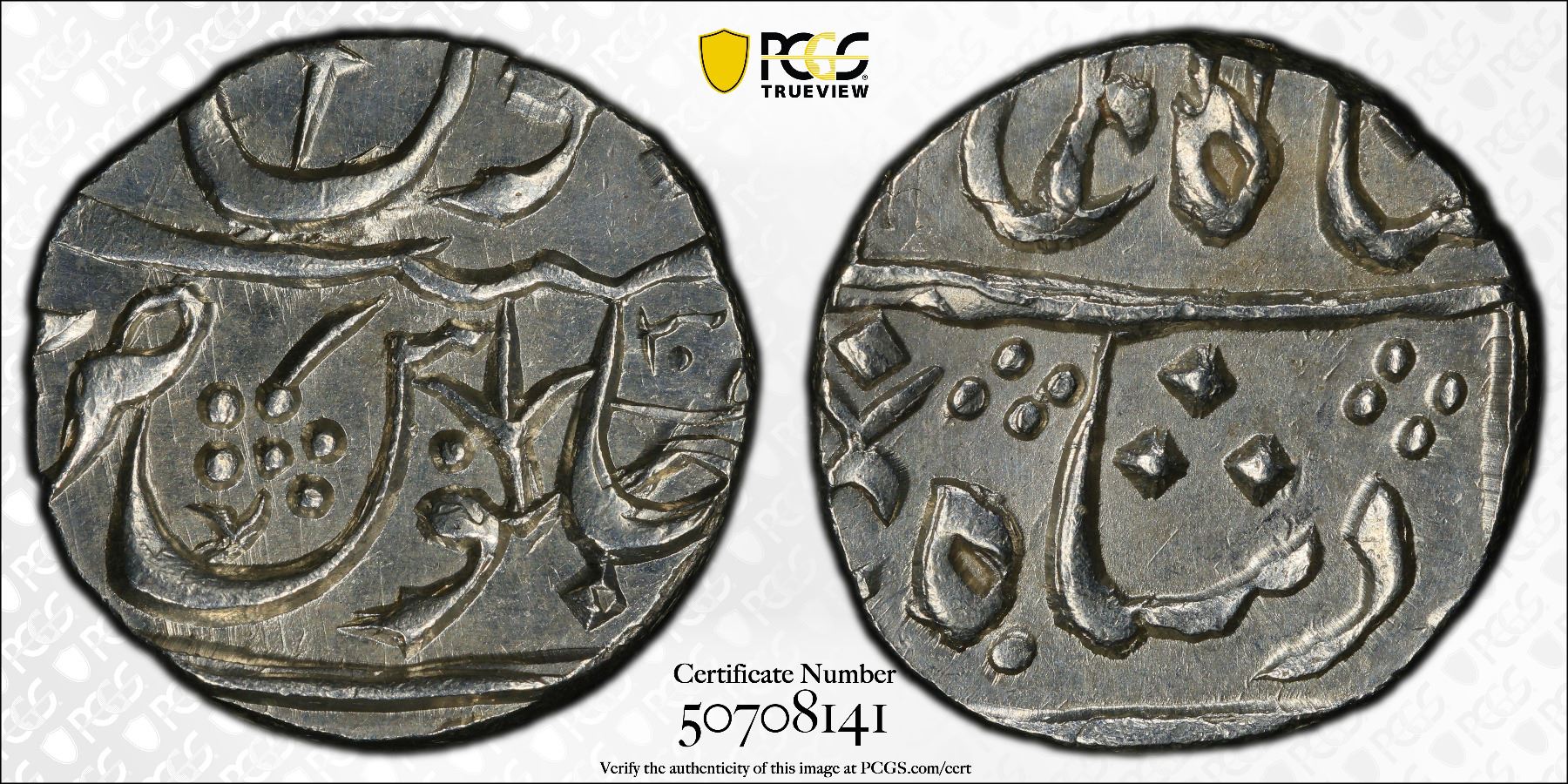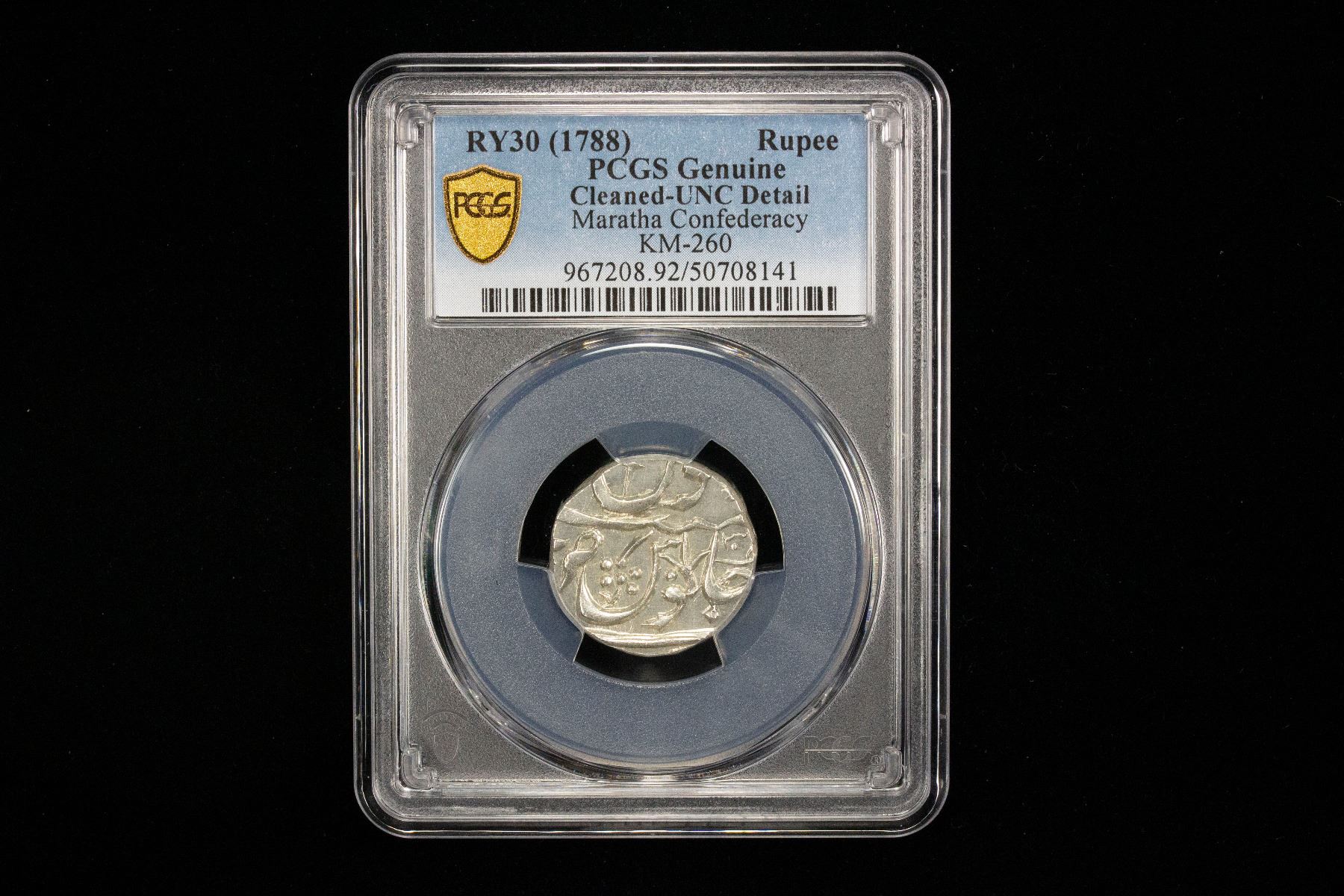 MARATHA CONFEDERACY: Chandor, AR rupee, ND, KM-260, full name written out is Jafarabad urf Chandor, in the name of Shah Alam II, cleaned, PCGS graded UNC details.