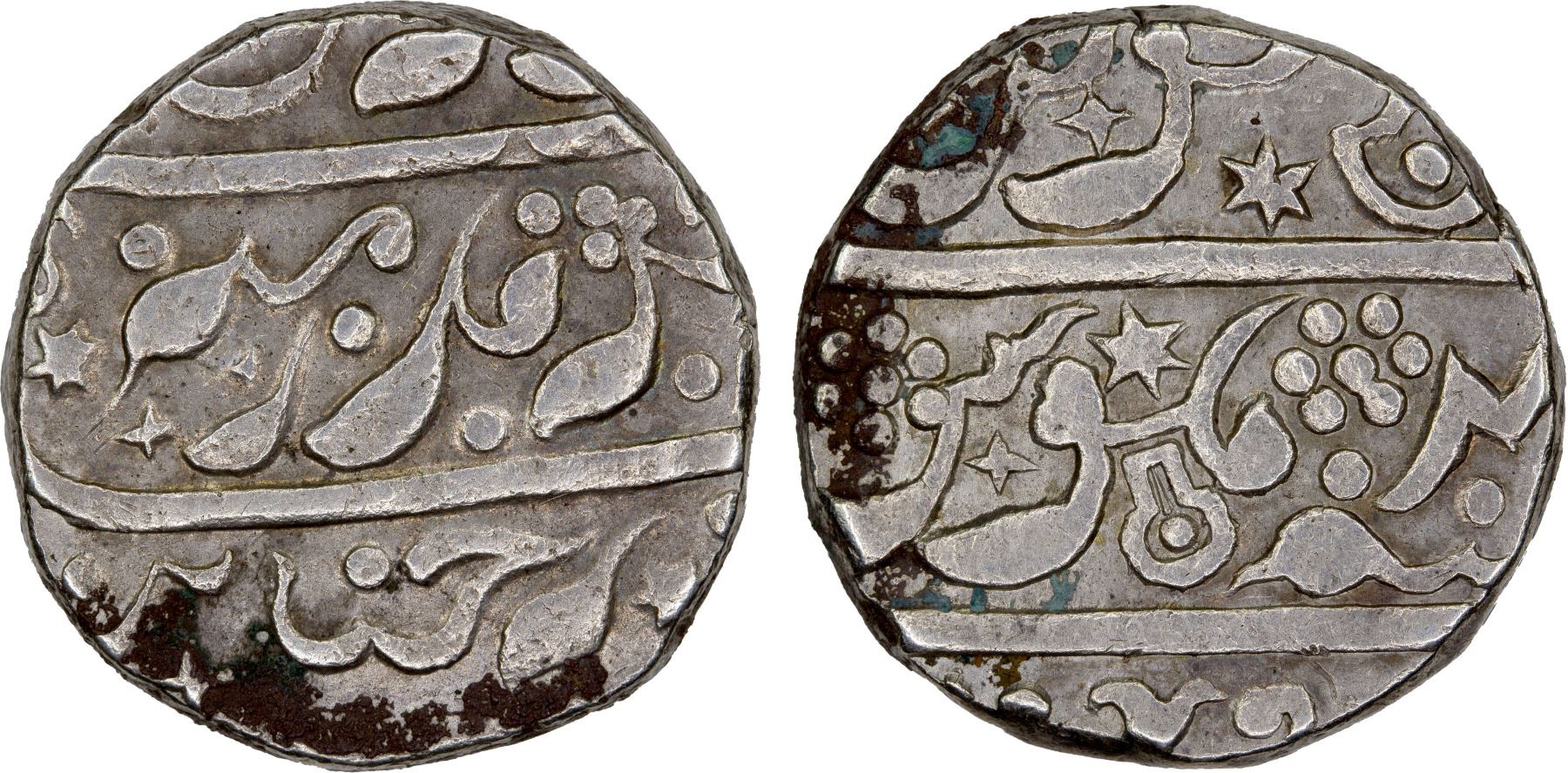 MARATHA CONFEDERACY: Chikodi, AR rupee (11.19g), ND, KM-185, mint name off-flan as usual, in the name of Aurangzeb but struck late 18th to early 19th century, with the lingam in the reverse center, also known as the Shivpindi of the deity Shiva, minor adhesions near the edge (removable), bold strike, XF.